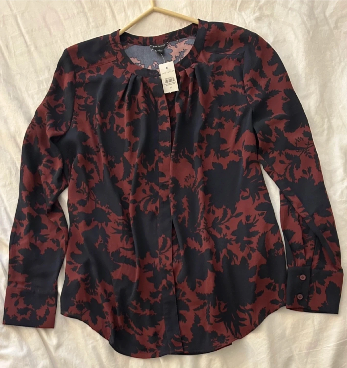 This is the Ann Taylor mixed media floral burgundy navy blouse.