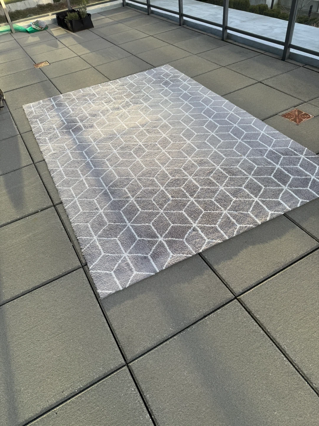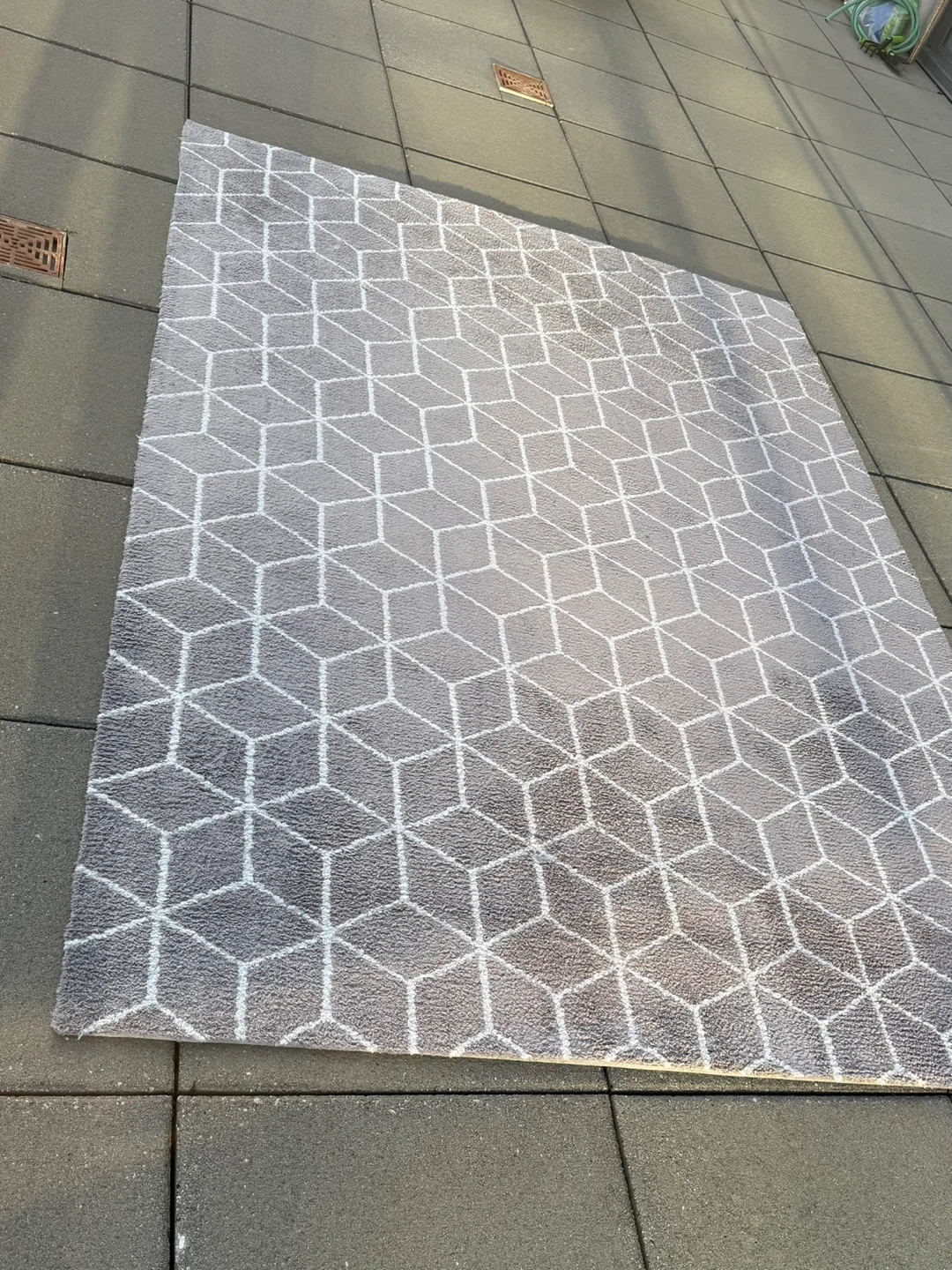 Grey and white area rug with a modern geometric pattern. Soft texture suitable for living spaces.
