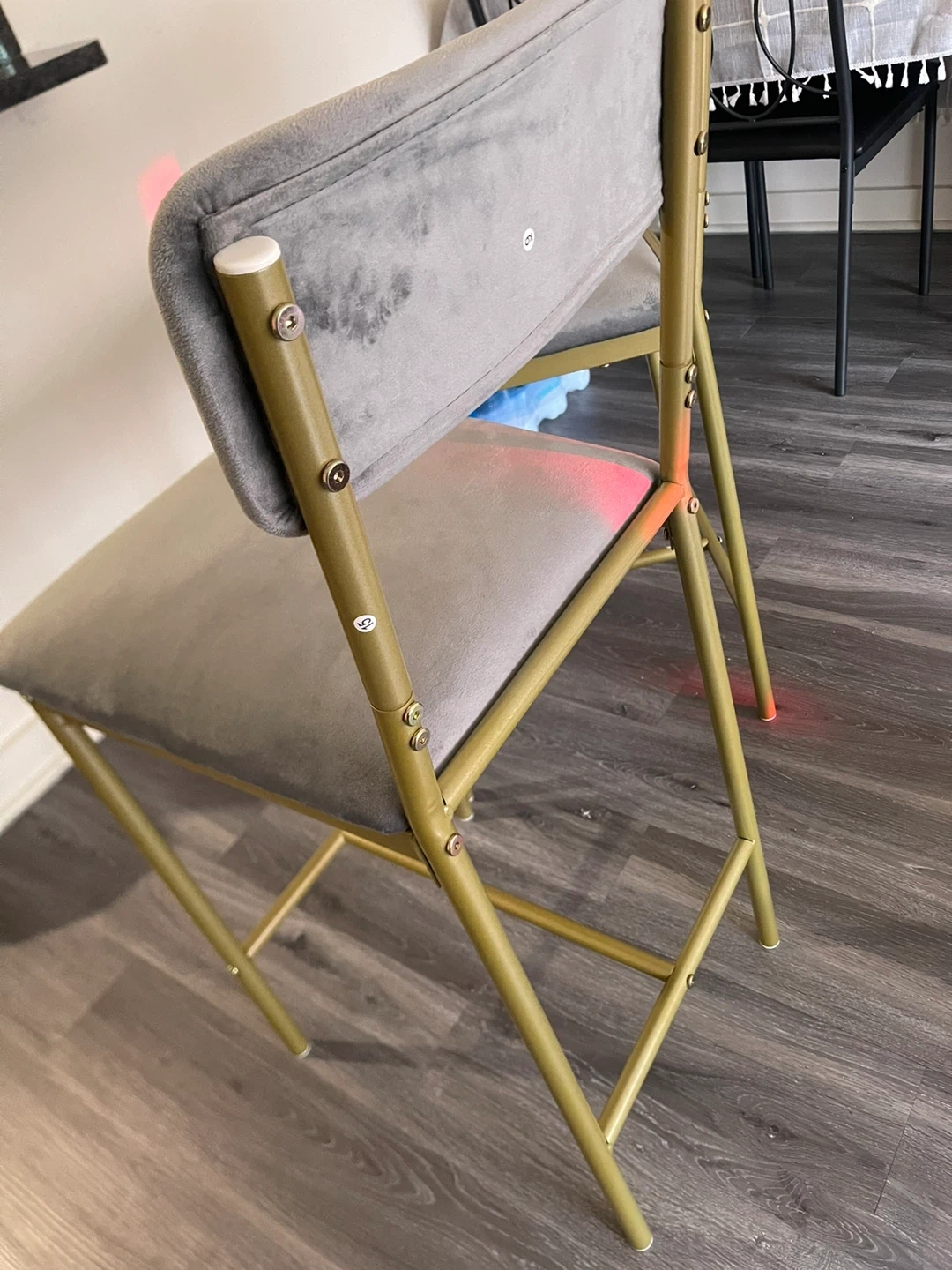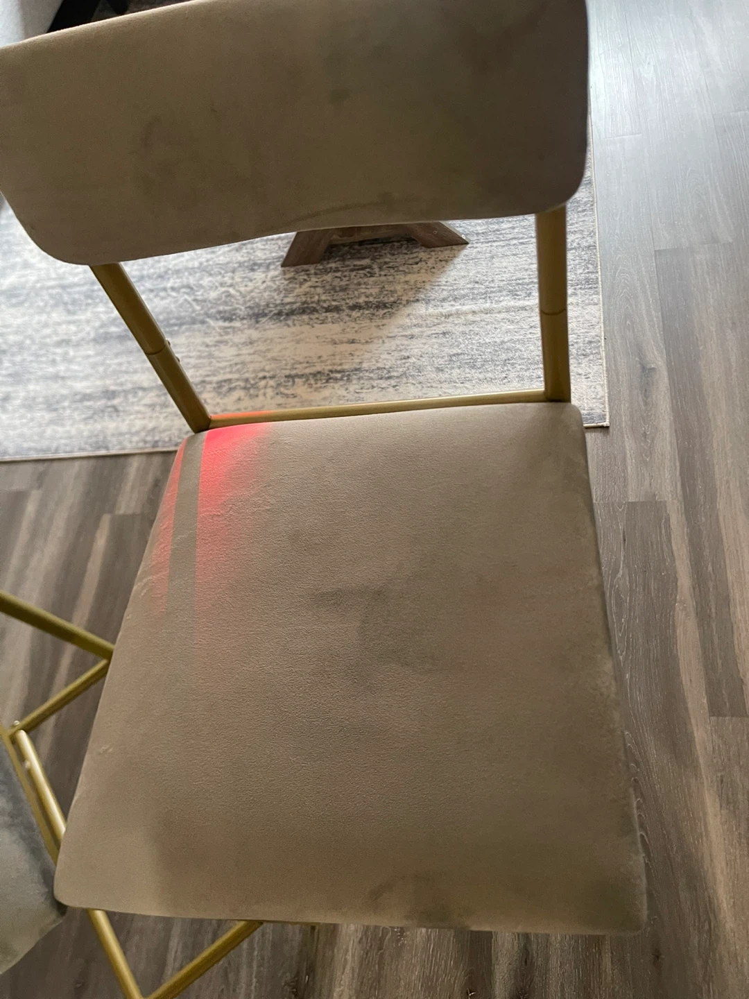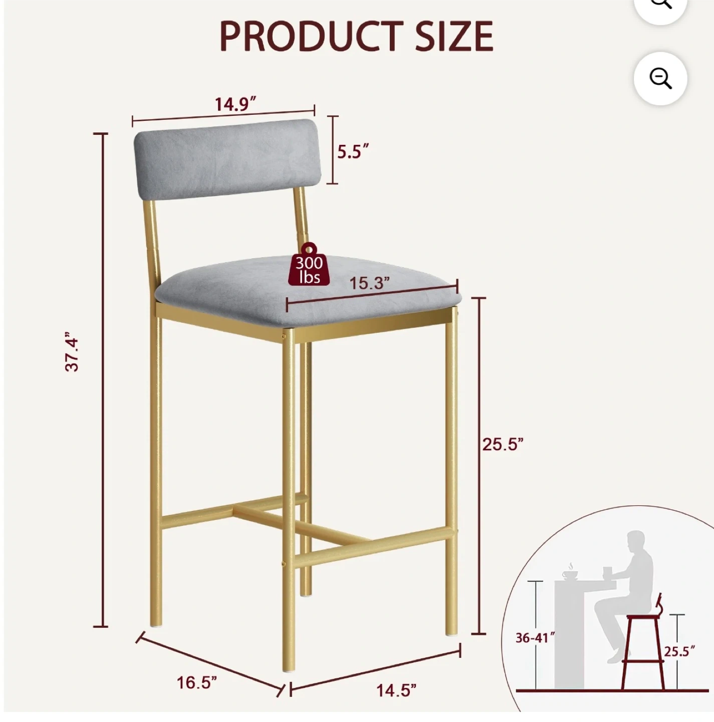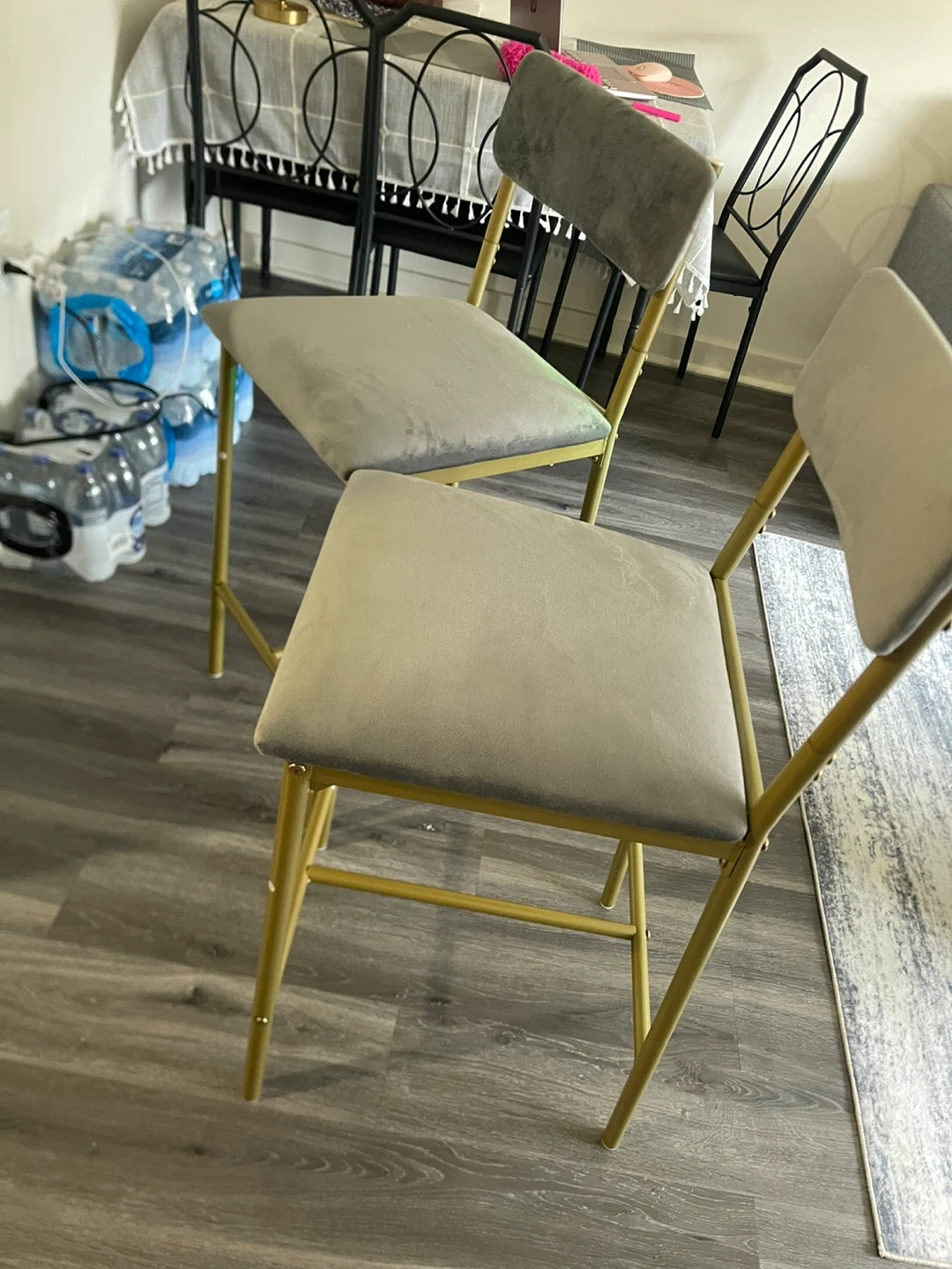 Two stylish bar stools upholstered in soft gray velvet. Perfect for a kitchen island or home bar area. Stool dimensions Seat height approx 26 inches. Brand new, didn’t even finish assemble yet.