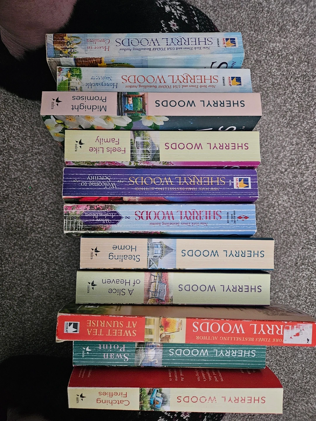 This is a lot of 11 paperback romance novels by Sherryl Woods. Titles include Catching Fireflies, Swan Point, and Sweet Tea at Sunrise, among others. These books are written for readers who enjoy contemporary romance stories. Pick up by WEM
