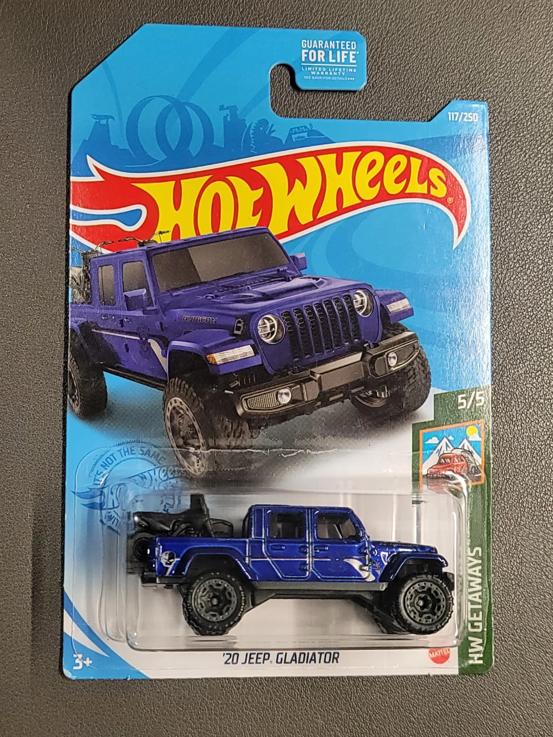 This is a blue '20 Jeep Gladiator toy truck from Hot Wheels HW Getaways series. It's part of the 117/250 collection. This item is recommended for ages 3 and up.