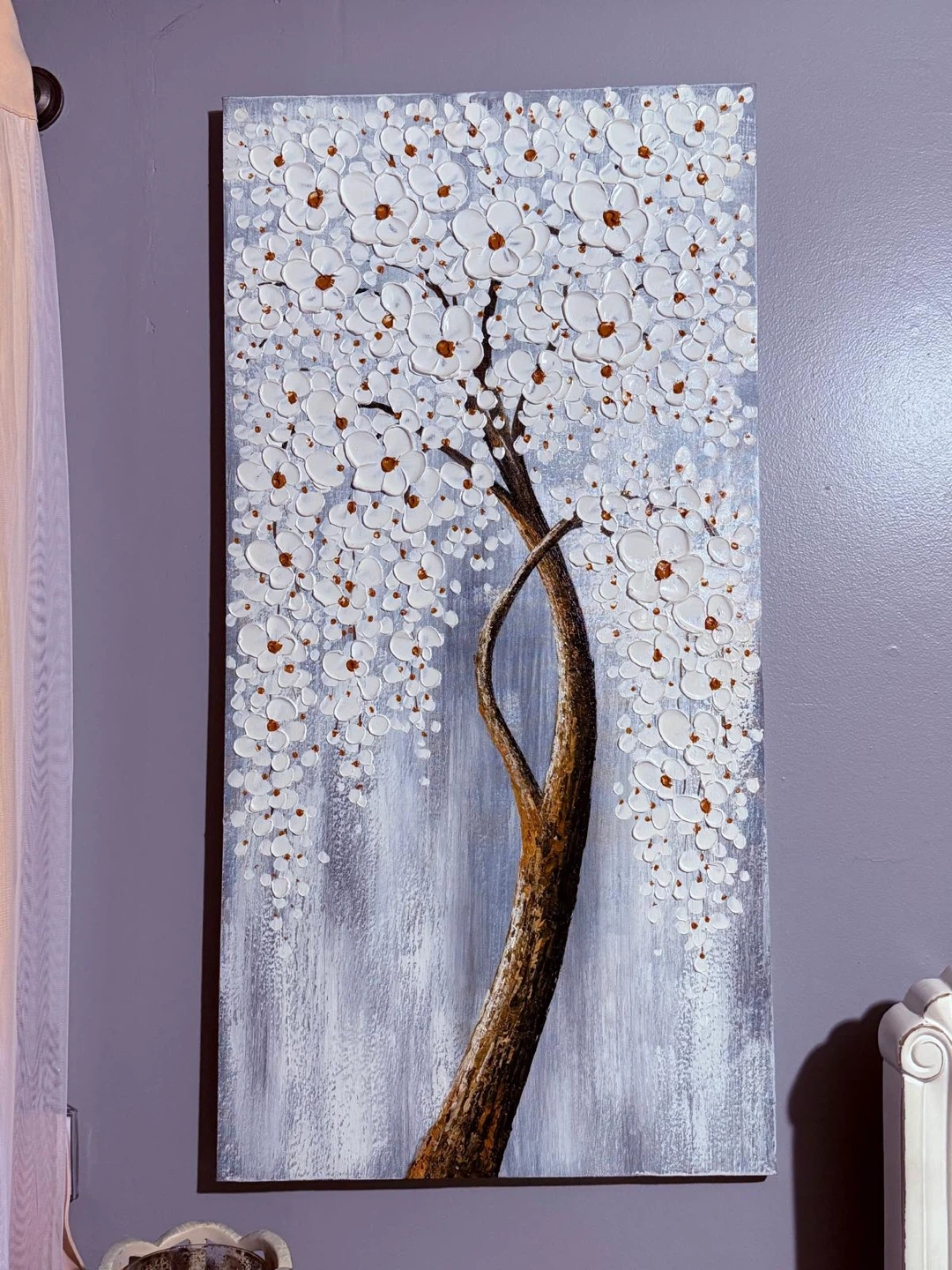 Textured painting of a white blossom tree. It features a thick impasto technique for a 3D effect on the flowers. This piece adds a touch of nature to any room!