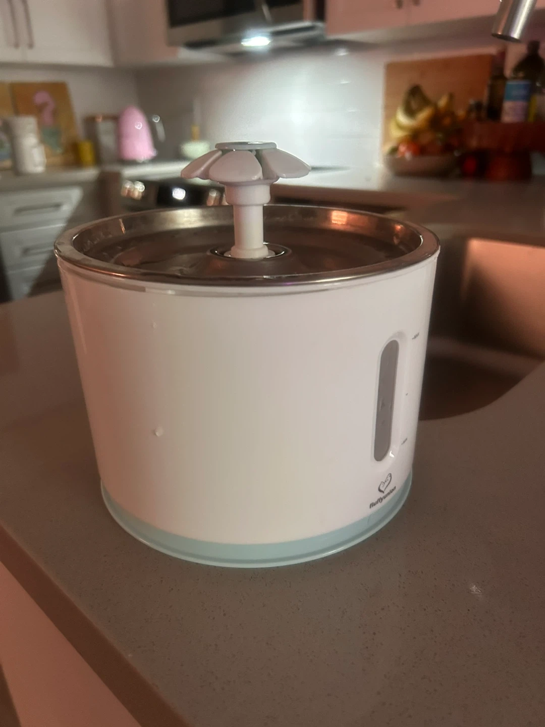 This is a Fluffyunion pet water fountain. It has a stainless steel top and a water level indicator. It's great for keeping your pet hydrated! Comes with 1 filter.