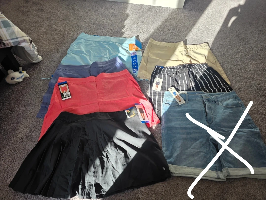 This lot includes seven pairs of women's shorts in various styles and colours. You'll find denim shorts, linen-blend shorts, and a pleated skirt-short. All are new with tags! Great for warmer weather.