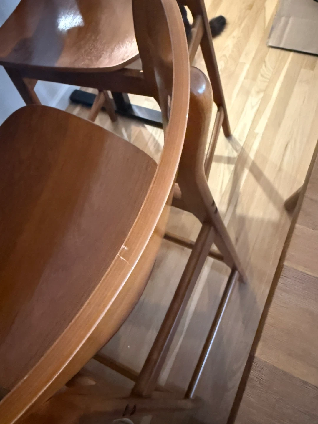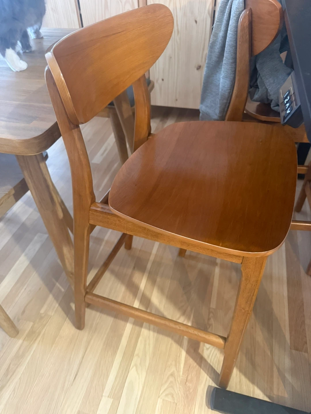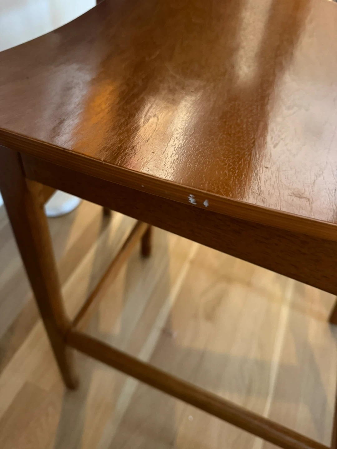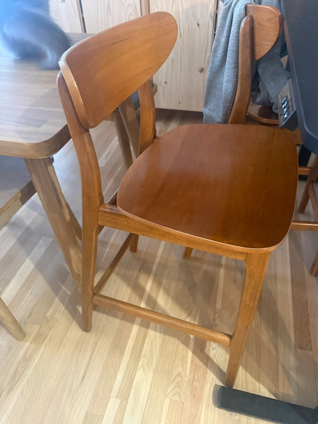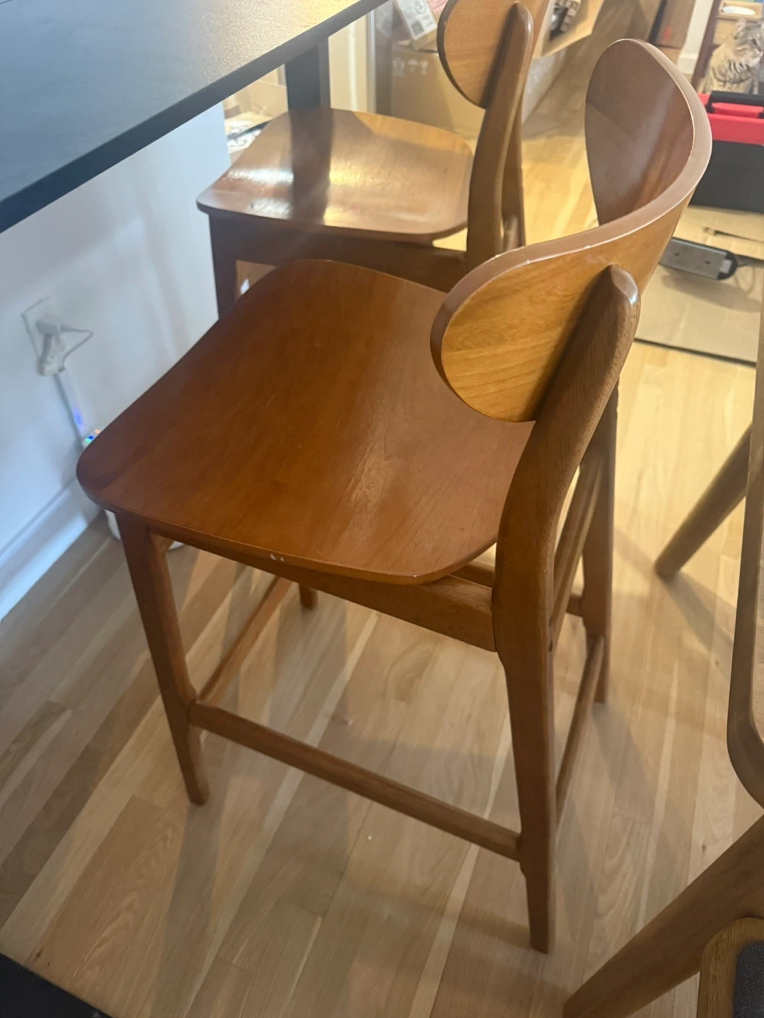 Two classic wooden bar stool chairs. Very comfortable. Some minor scuffs are visible on the seat's edge and some minor scratches on the seats. Used for 2.5yr. This stool is perfect for a kitchen island or home bar setup.