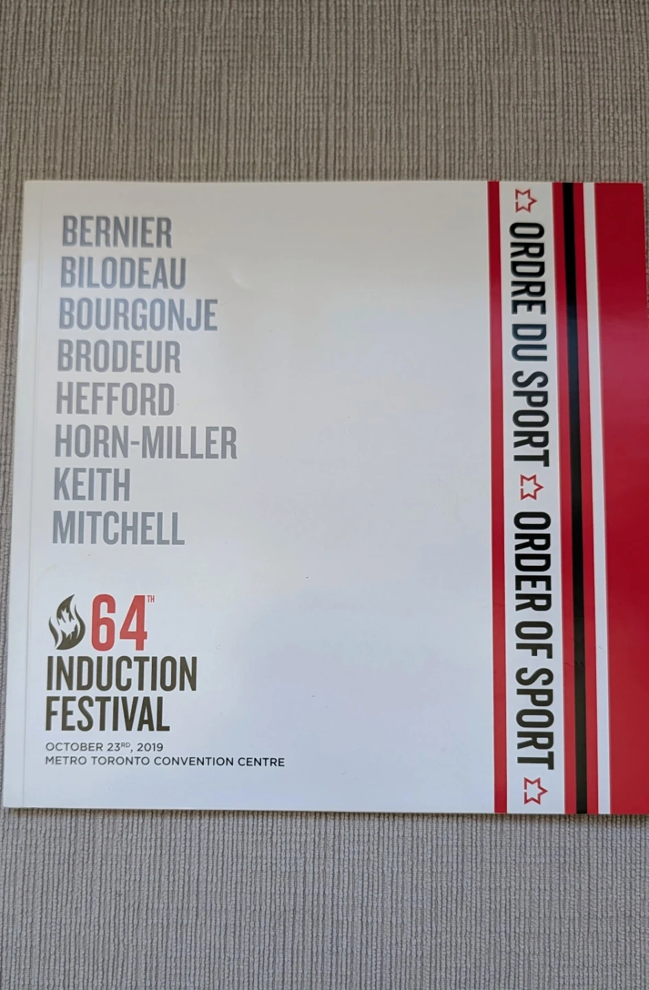 This is a program from the 64th Order of Sport Induction Festival held on October 23rd, 2019 at the Metro Toronto Convention Centre. It lists the inductees for that year. The program features a red and white design with black accents.