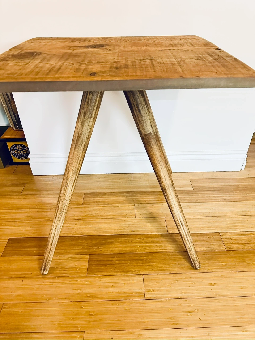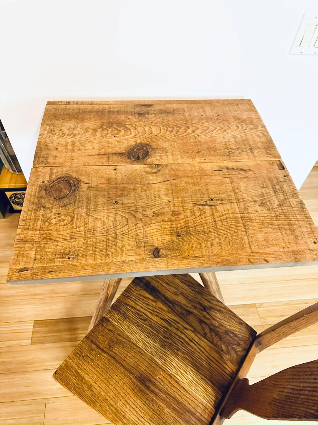 A cute little bistro table / desk made from authentic reclaimed barn board. Solid oak antique chair. Ideal size for smaller spaces.