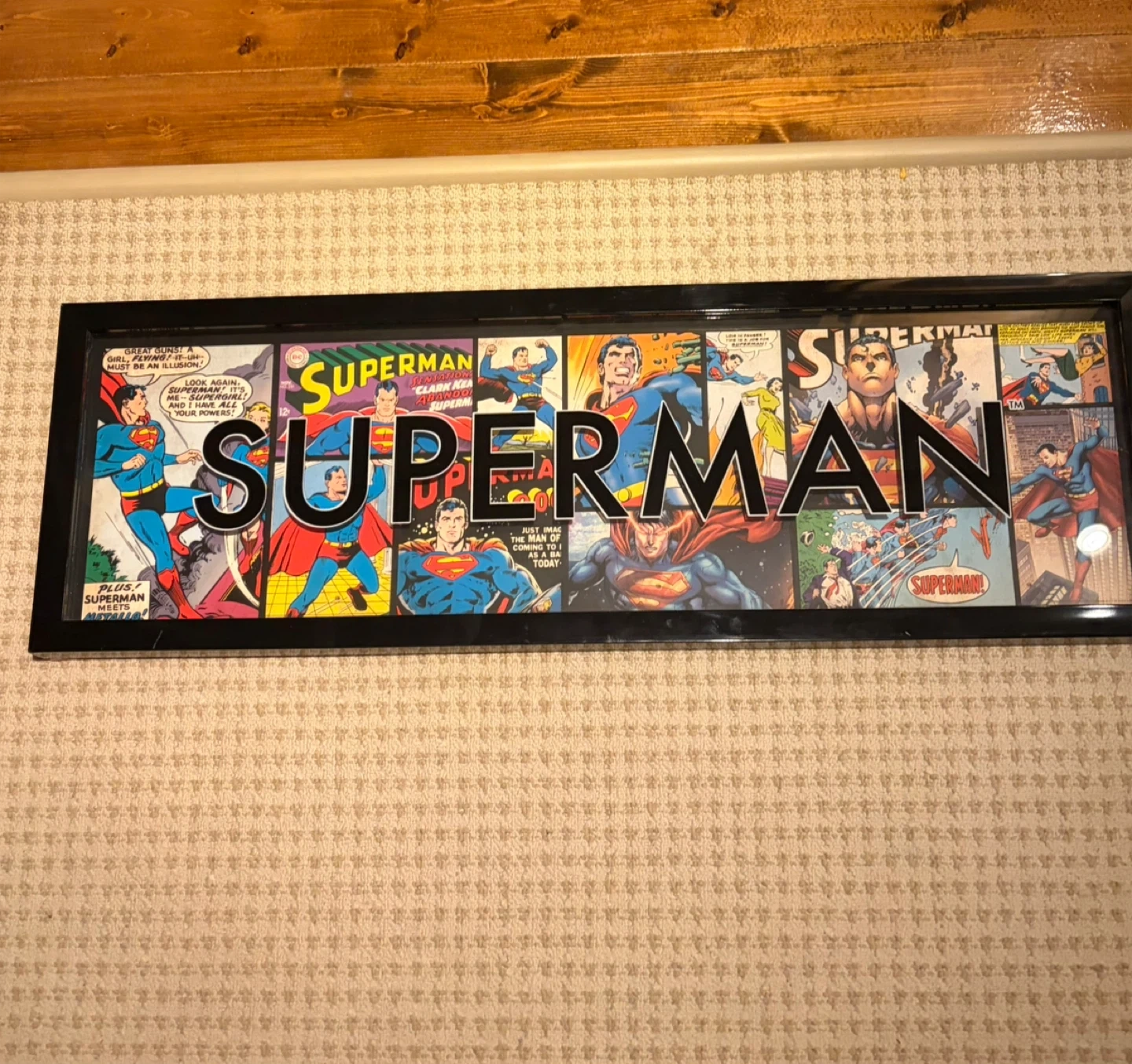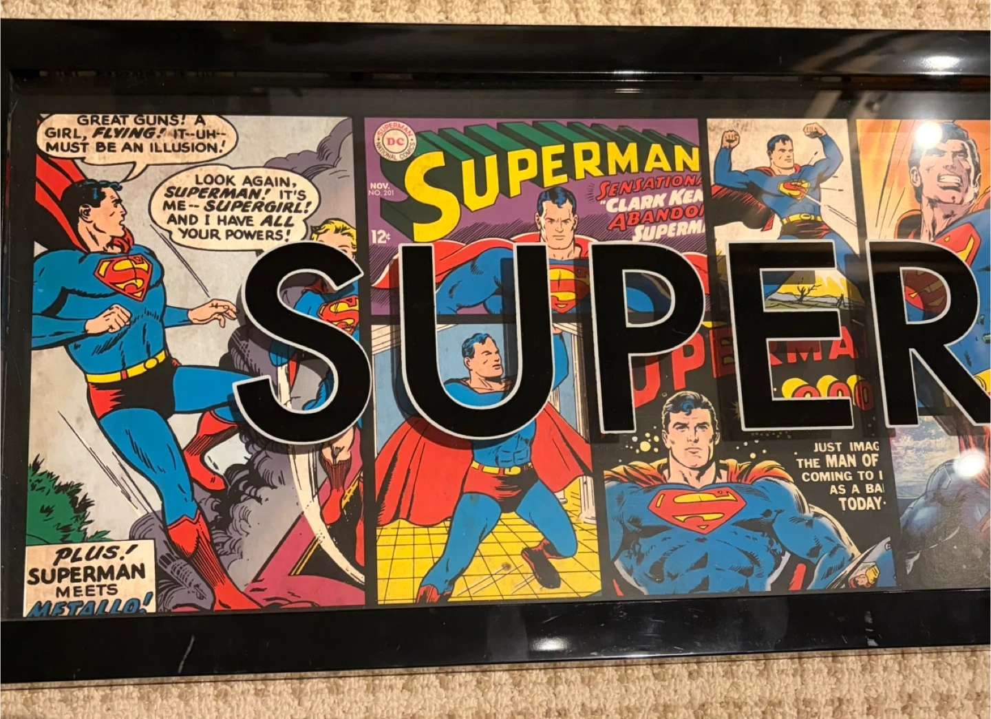 This framed art piece showcases iconic Superman comic book panels. It's a great way to display your love for the Man of Steel. Perfect for any fan's collection!