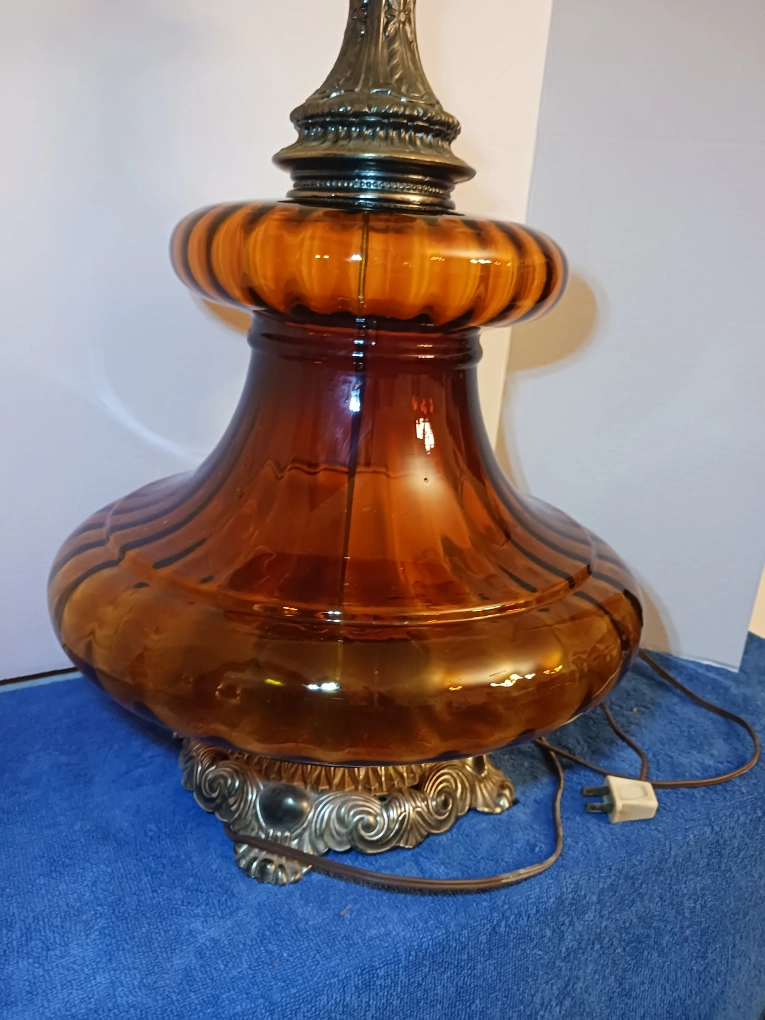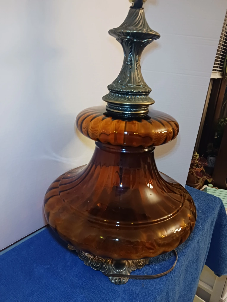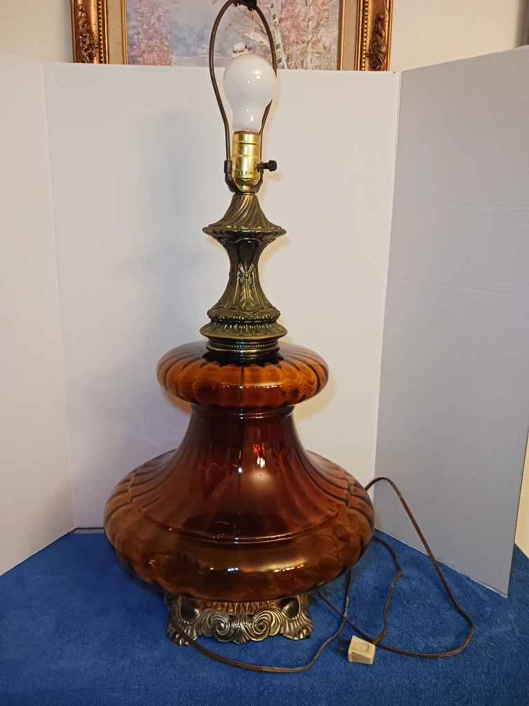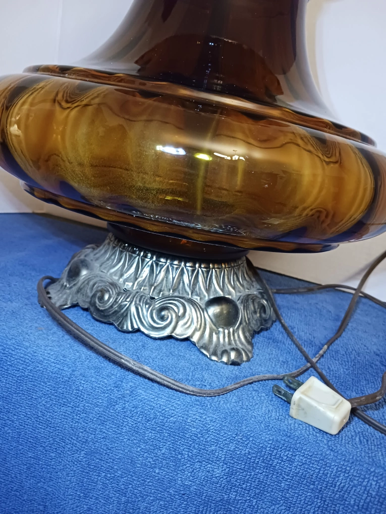 This vintage MCM 1972 table lamp features a decorative amber glass body with a metal base. no shade..It includes a bulb and power cord. It's a unique piece that adds a warm glow to any room. The lamp's design is ornate and eye-catching. This would be a great accent piece for a living room or bedroom.
