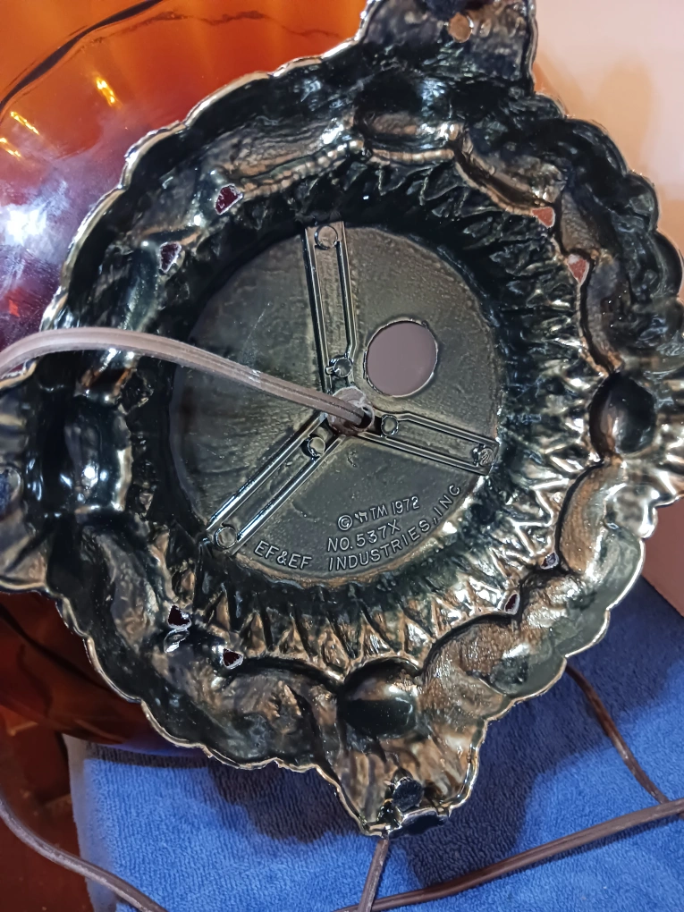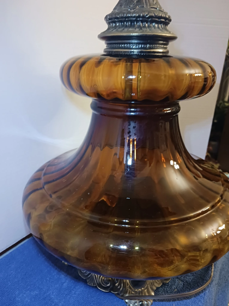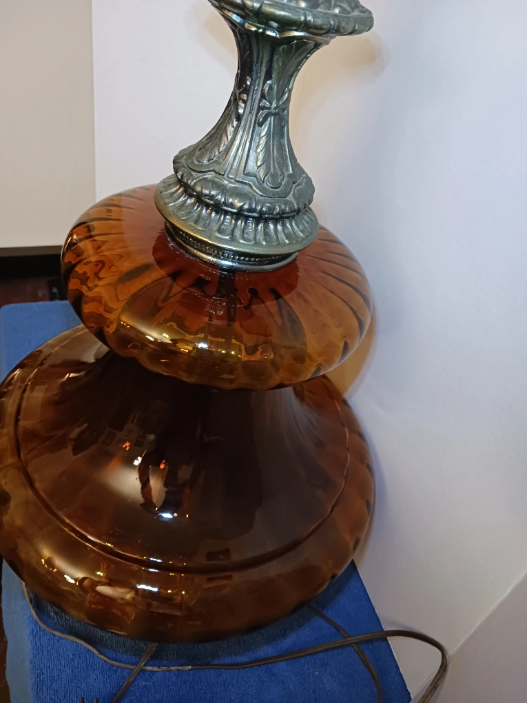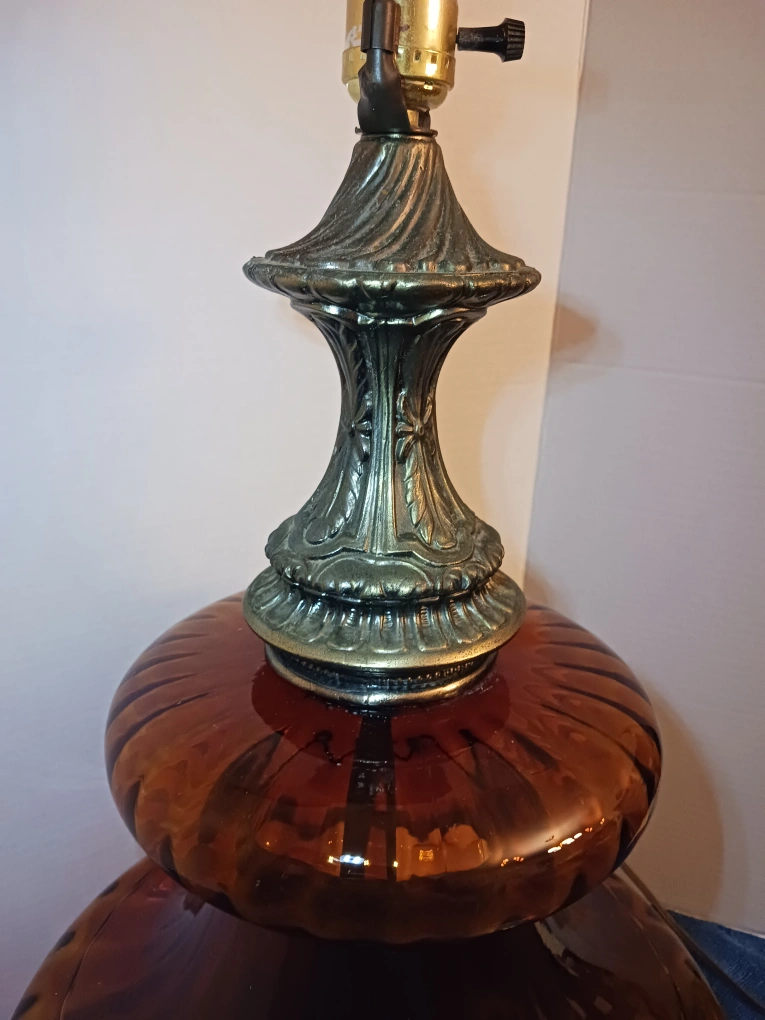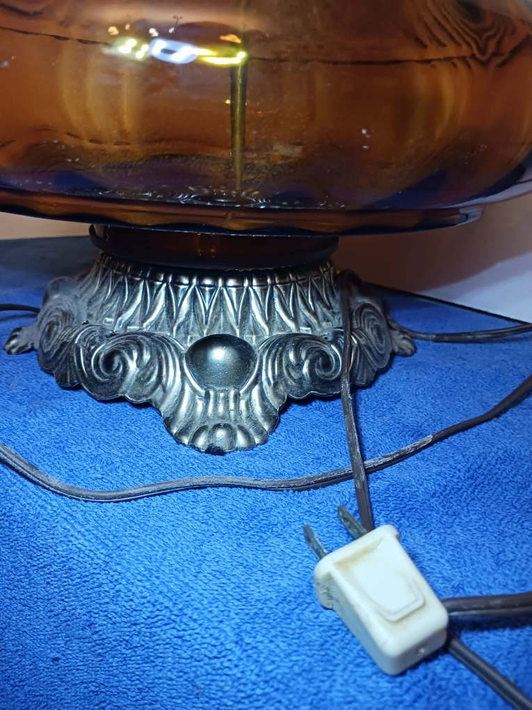 This vintage MCM 1972 table lamp features a decorative amber glass body with a metal base. no shade..It includes a bulb and power cord. It's a unique piece that adds a warm glow to any room. The lamp's design is ornate and eye-catching. This would be a great accent piece for a living room or bedroom.