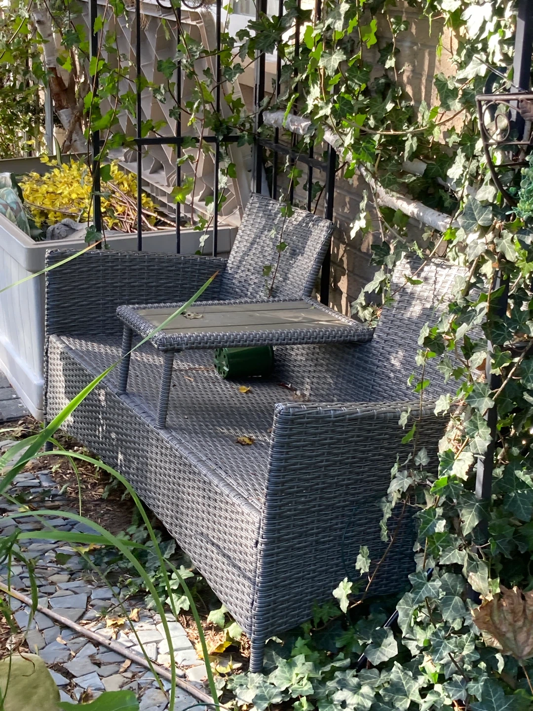 Wicker outdoor loveseat with built-in table