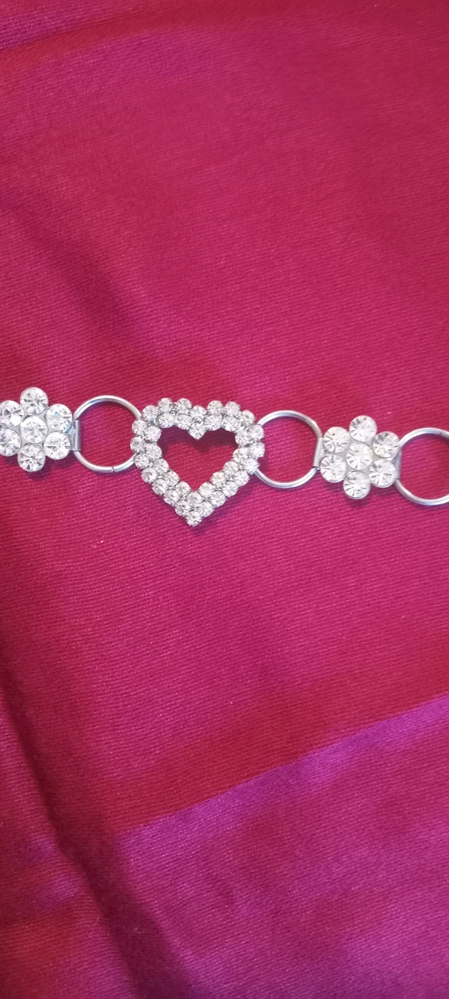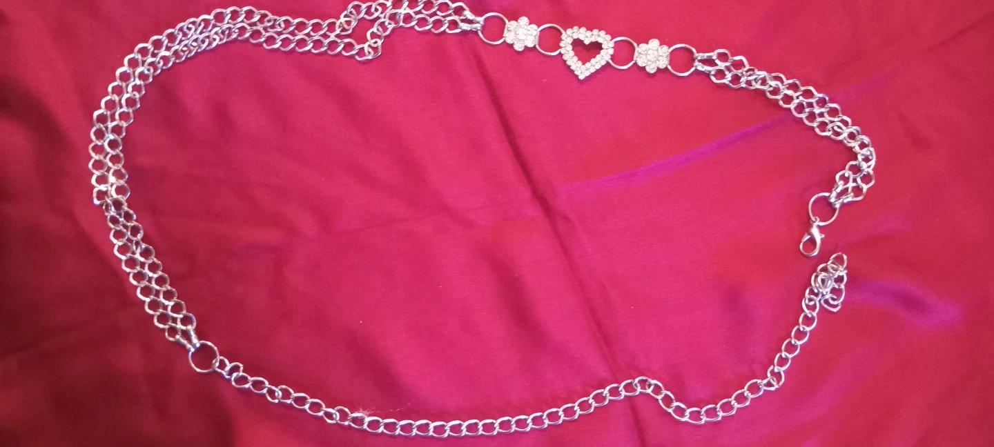 This is a lovely silver-tone chain belt featuring a central heart charm adorned with rhinestones. It also has flower charms with rhinestones on either side. The belt has a lobster clasp closure and an adjustable chain for a comfortable fit.