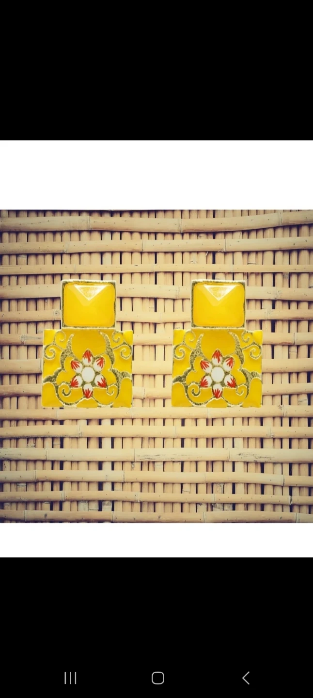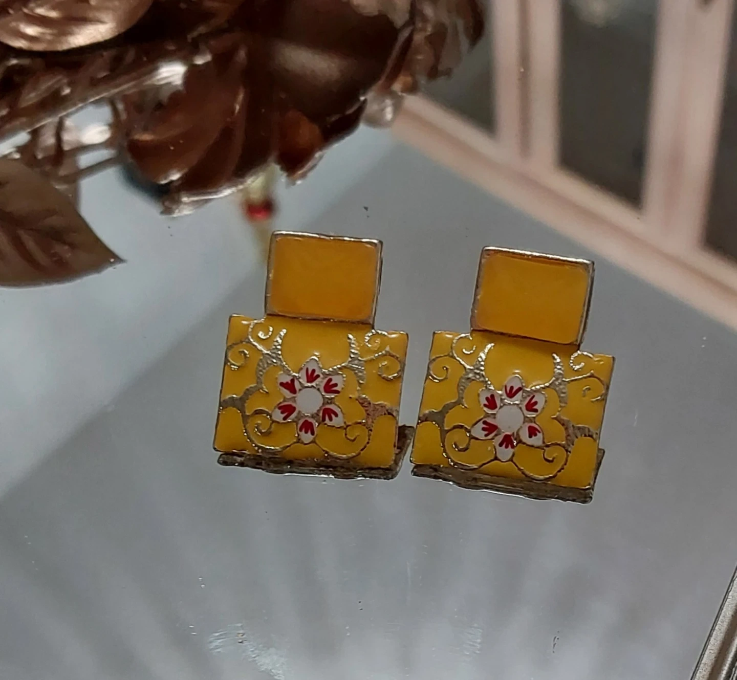 These earrings feature a yellow enamel square design with a red and white floral motif and silver-tone accents. They have a post-back closure for secure wear. These would add a pop of colour to any outfit!