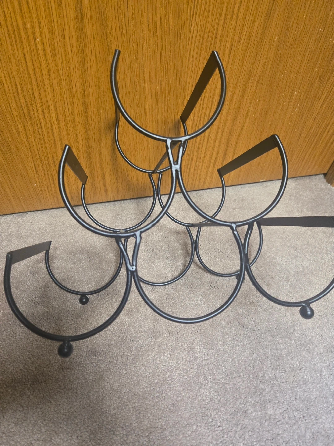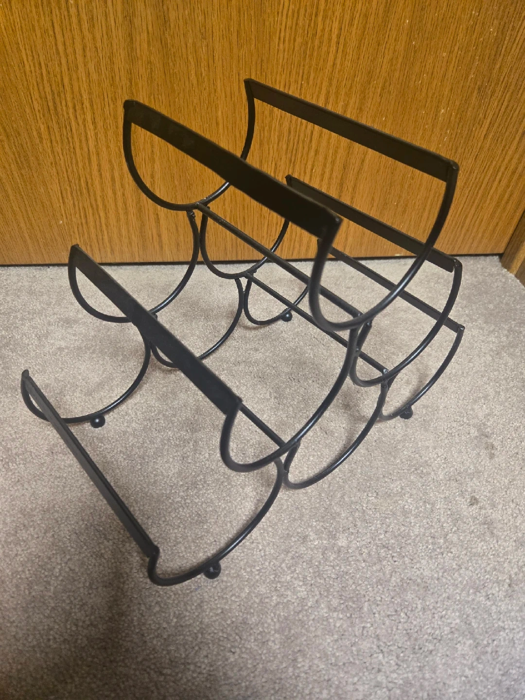 Here's a stylish black metal wine rack that can hold up to 6 bottles! It's in great shape and perfect for displaying your favorite wines in your home