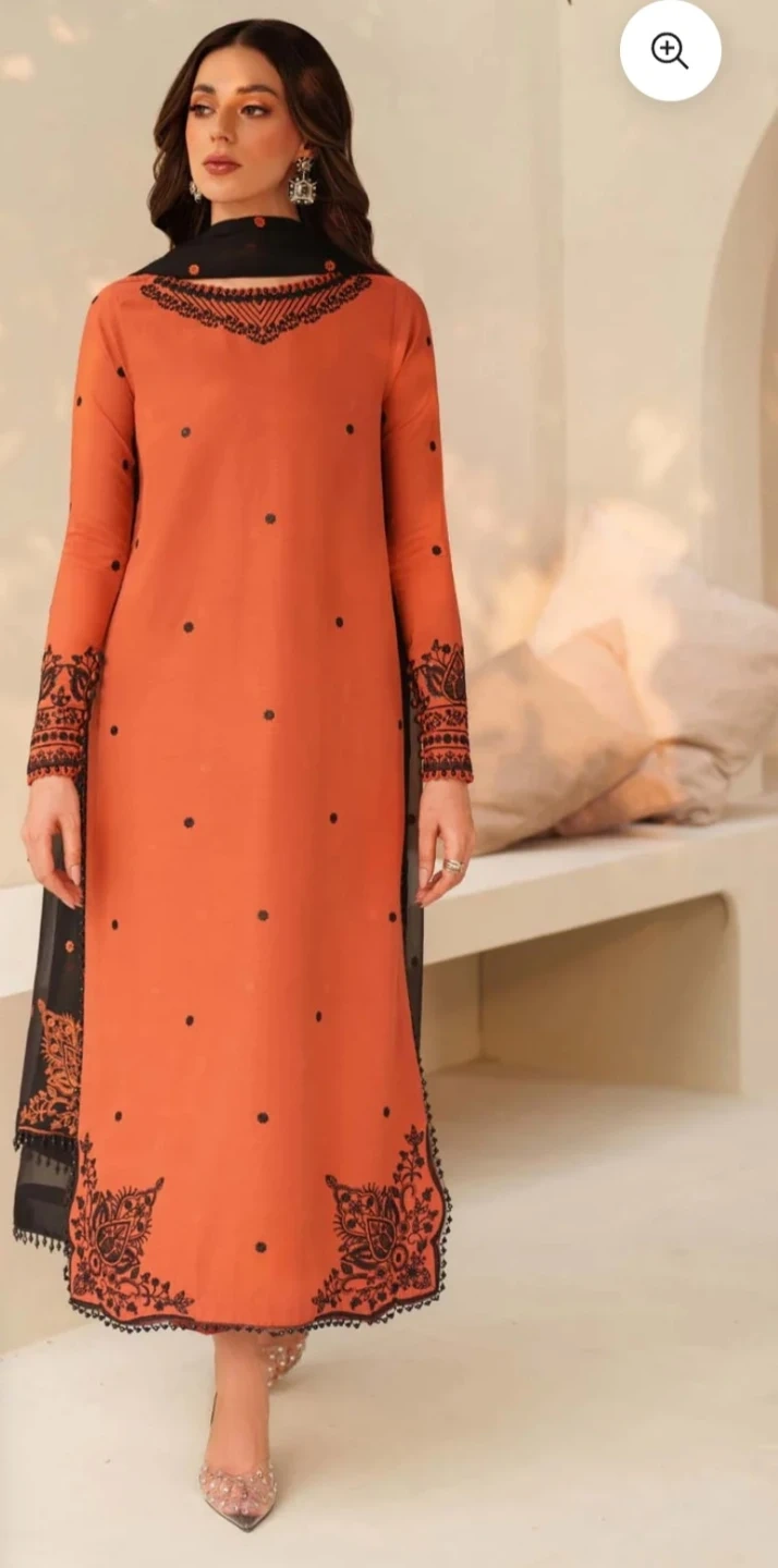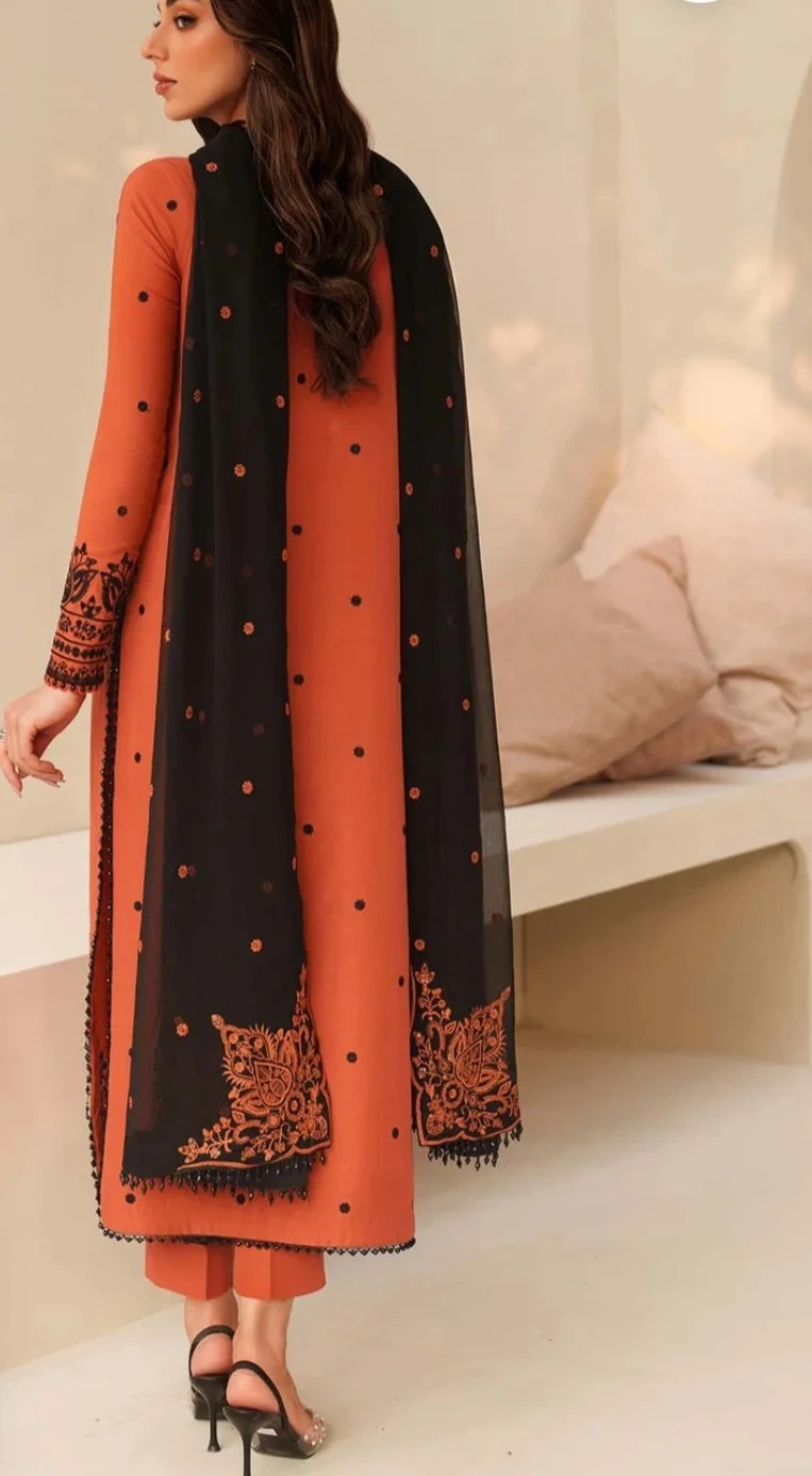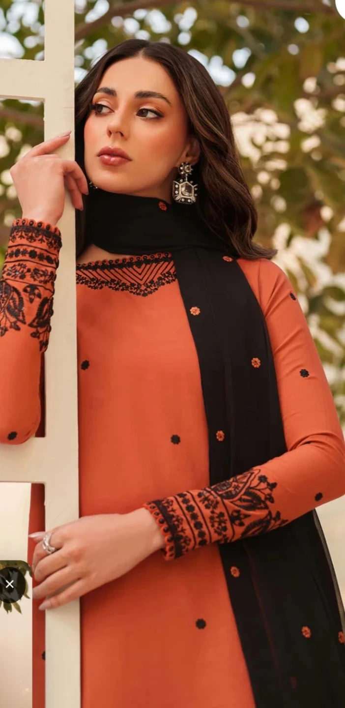 Beautiful orange kurti with black embroidery and matching dupatta. Features long sleeves and intricate neckline detailing. Offers a stylish and traditional look.