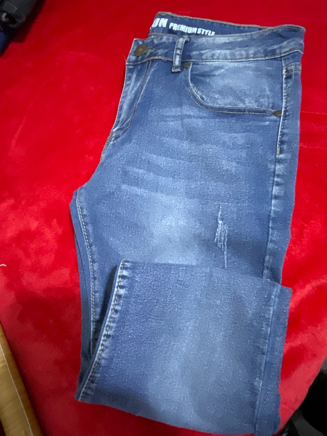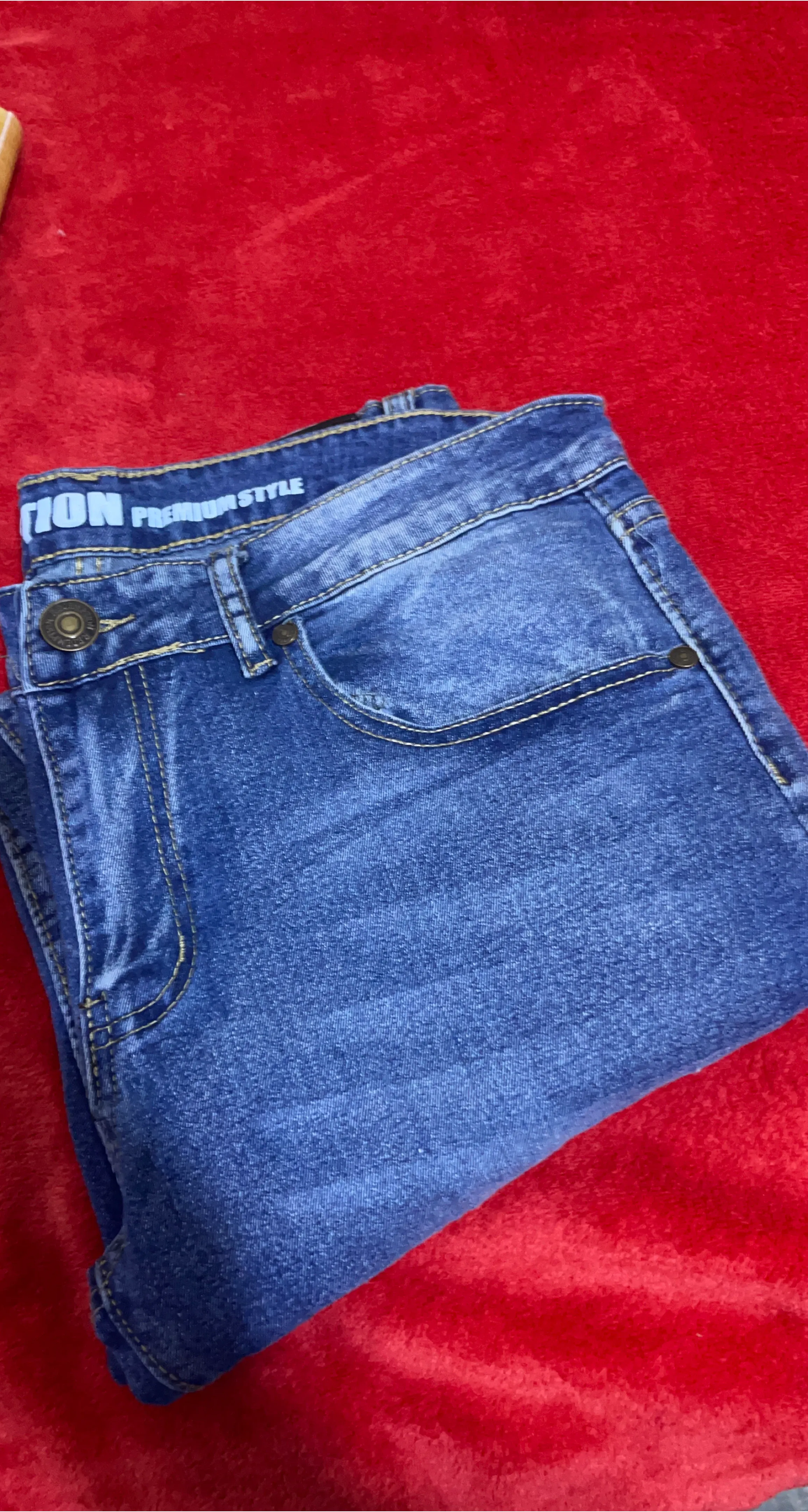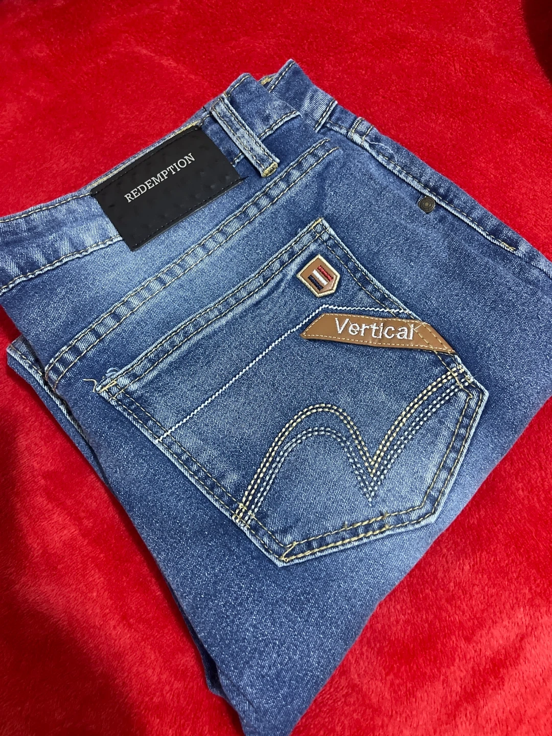 These are VERTICAL Redemption jeans in a classic blue denim wash. They feature a traditional five-pocket design with button and zipper closure. The denim material is durable and comfortable for everyday wear.