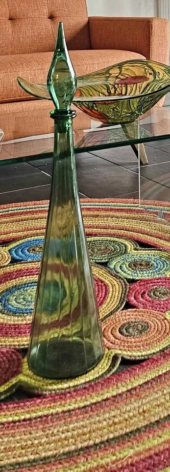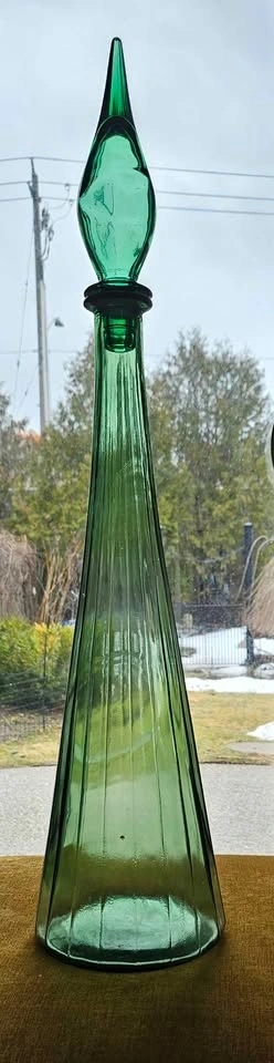 Attributed to Empoli, this genie bottle stands at an impressive 26" with stopper and approximately 19" without. This style is often referred to as panel, and is one of the larger genie bottles. There are no markings on the bottom. The base is 6". There are no cracks or chips. The bung is missing from the stopper.