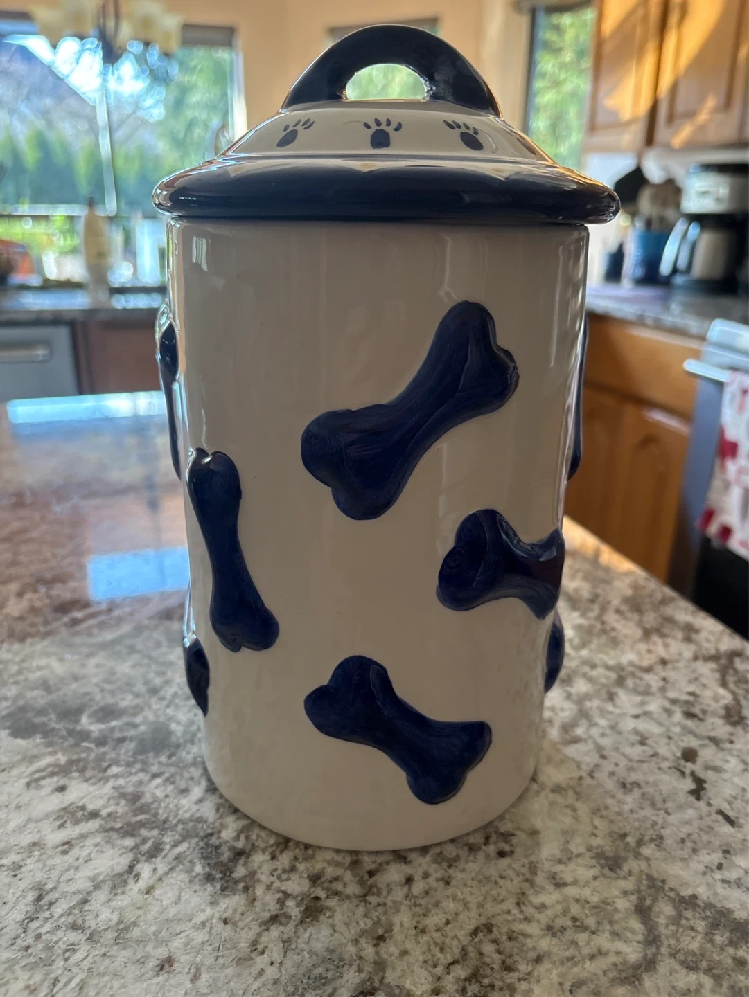 This ceramic jar is perfect for storing dog treats. It features a cute design with blue bones and paw prints all over. It has a secure lid to keep treats fresh. Ceramic material.