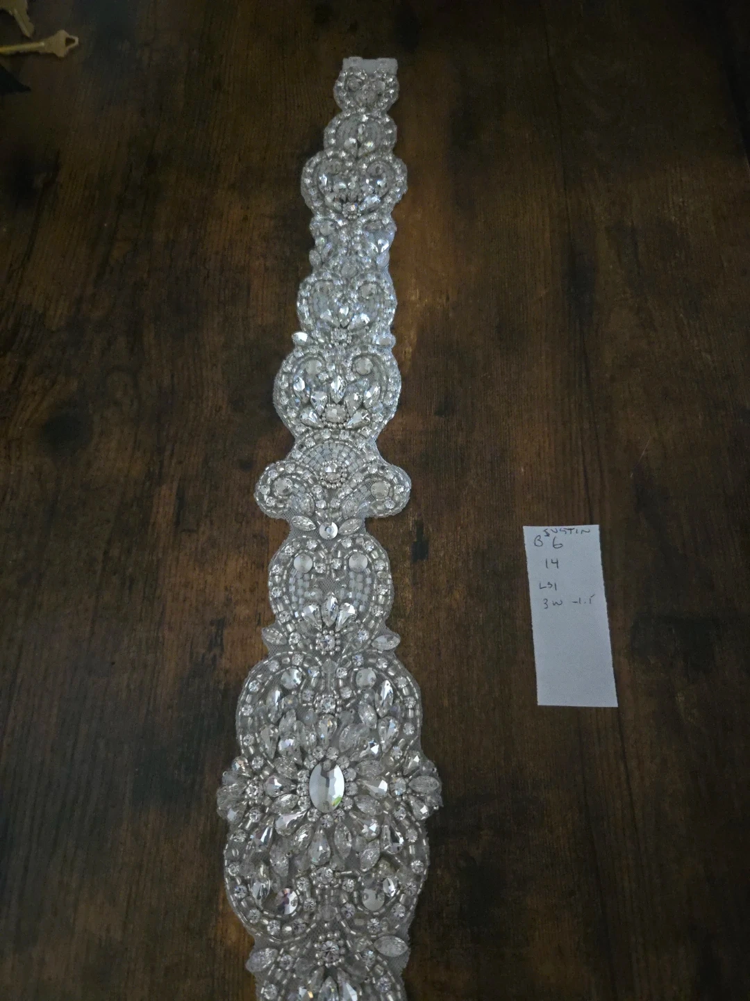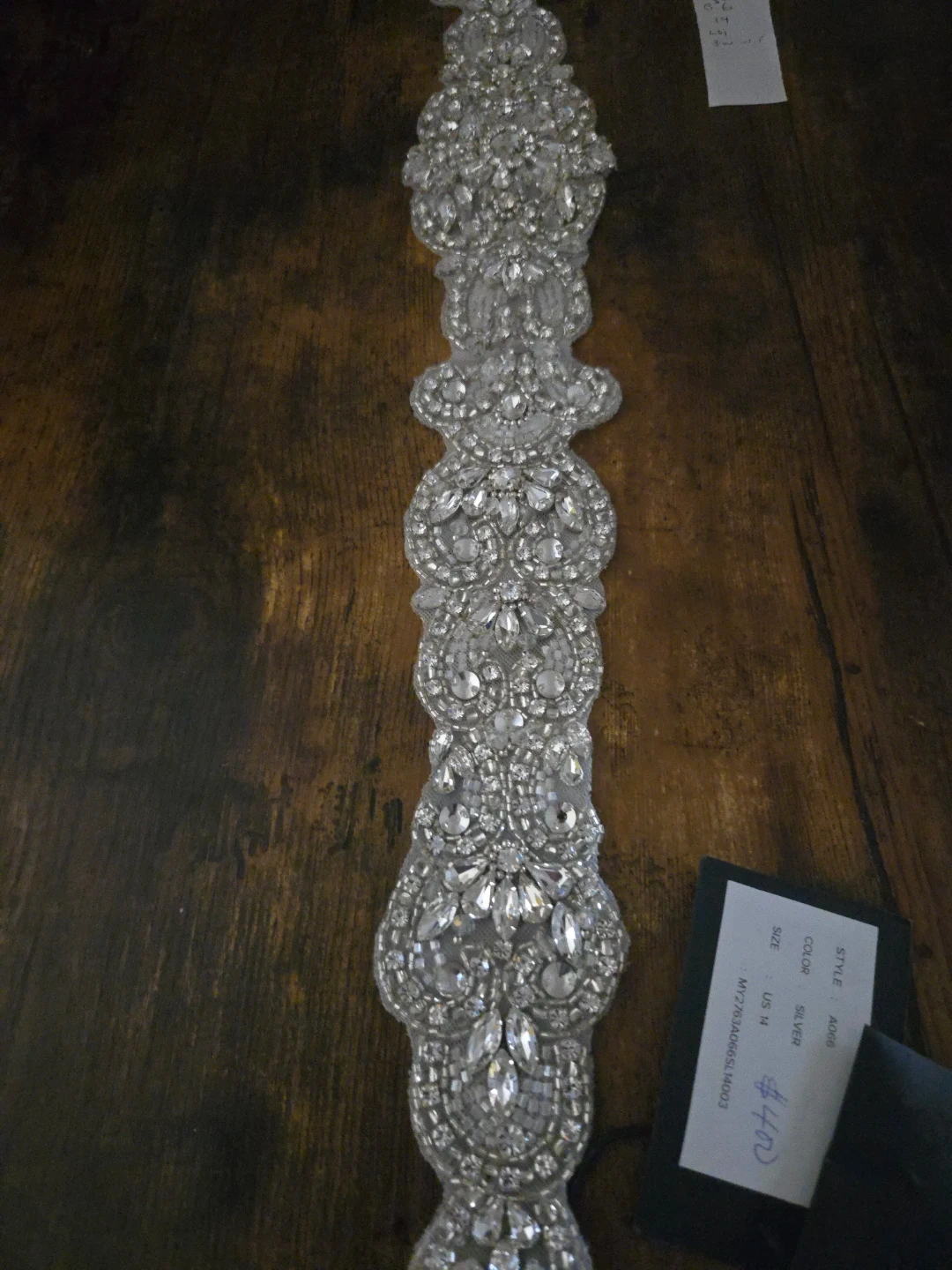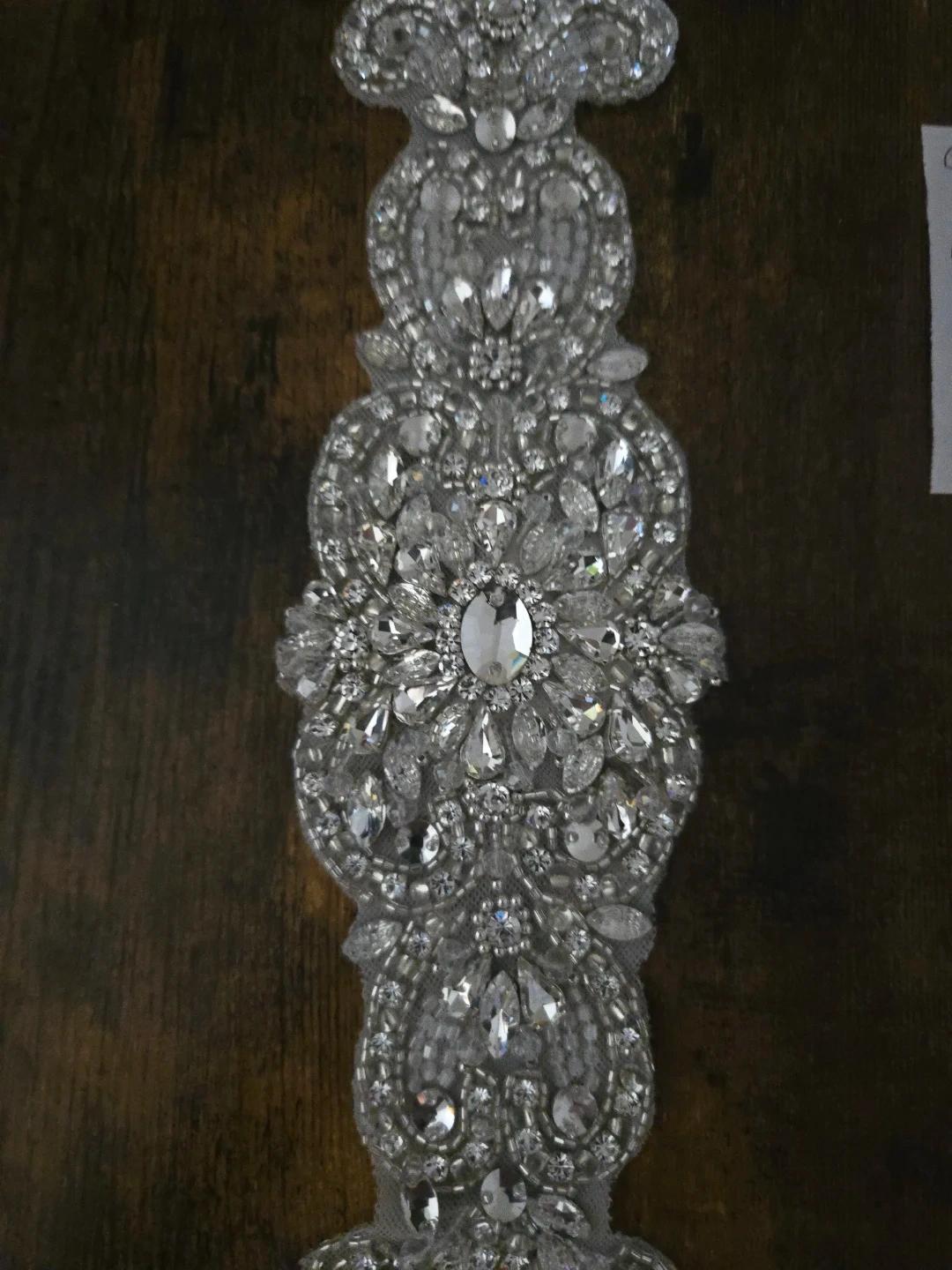 Sparkly rhinestone belt sash for bridal wear. Silver color with intricate beadwork. It's a stunning accessory for a wedding dress!