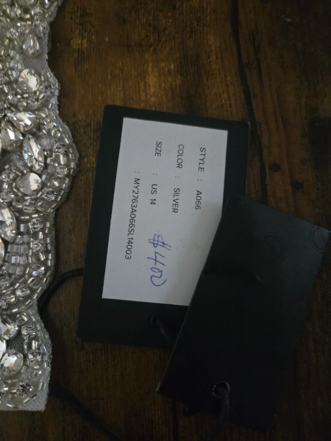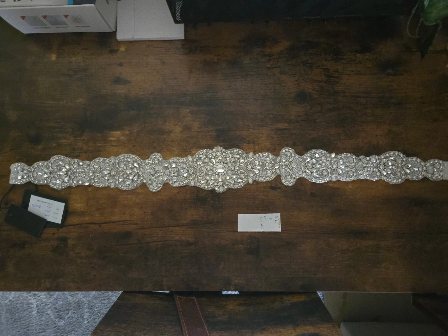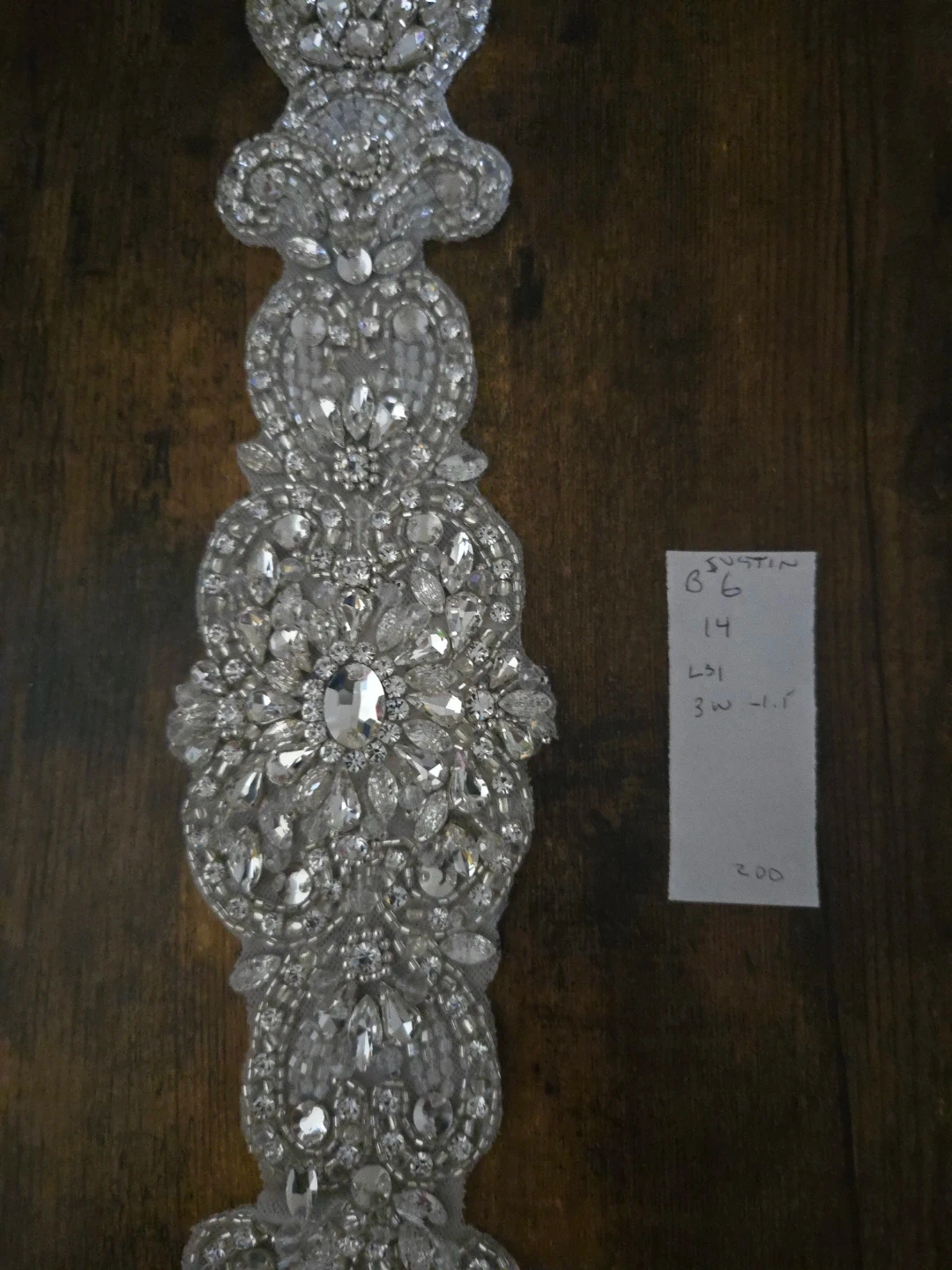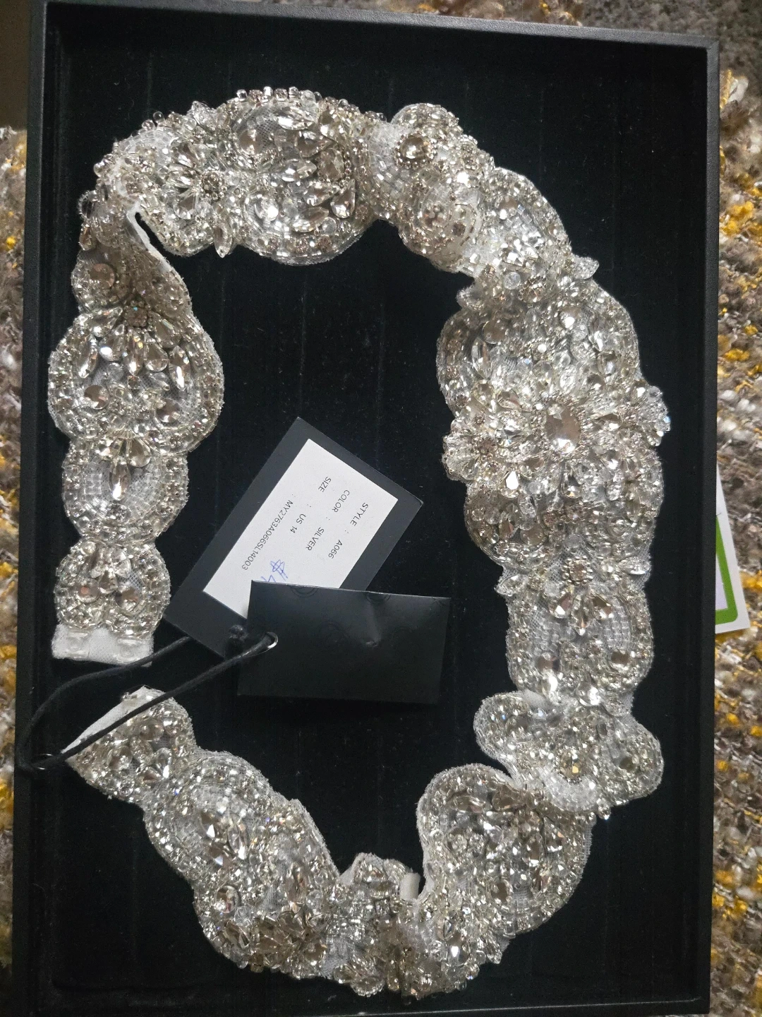 Sparkly rhinestone belt sash for bridal wear. Silver color with intricate beadwork. It's a stunning accessory for a wedding dress!