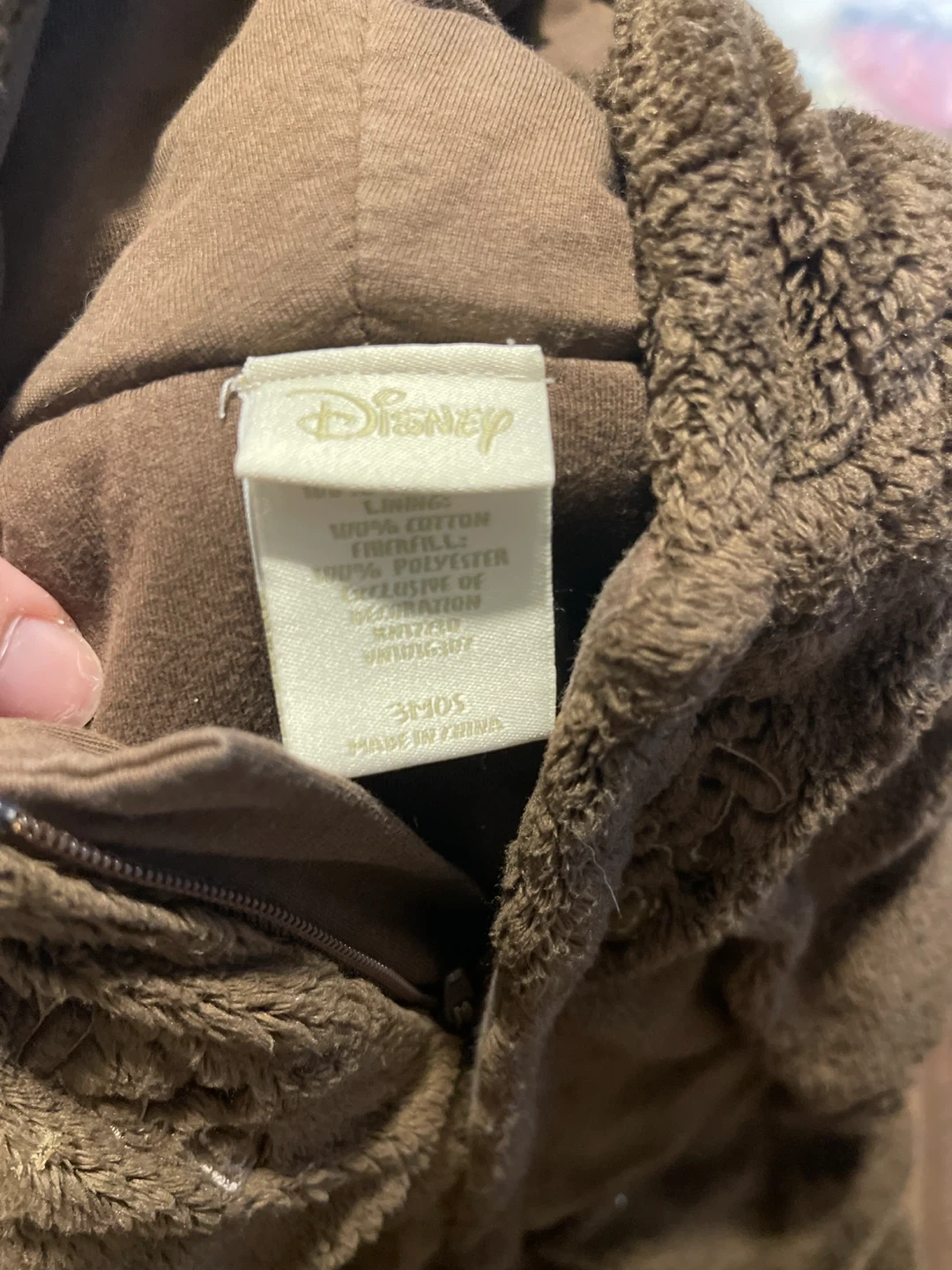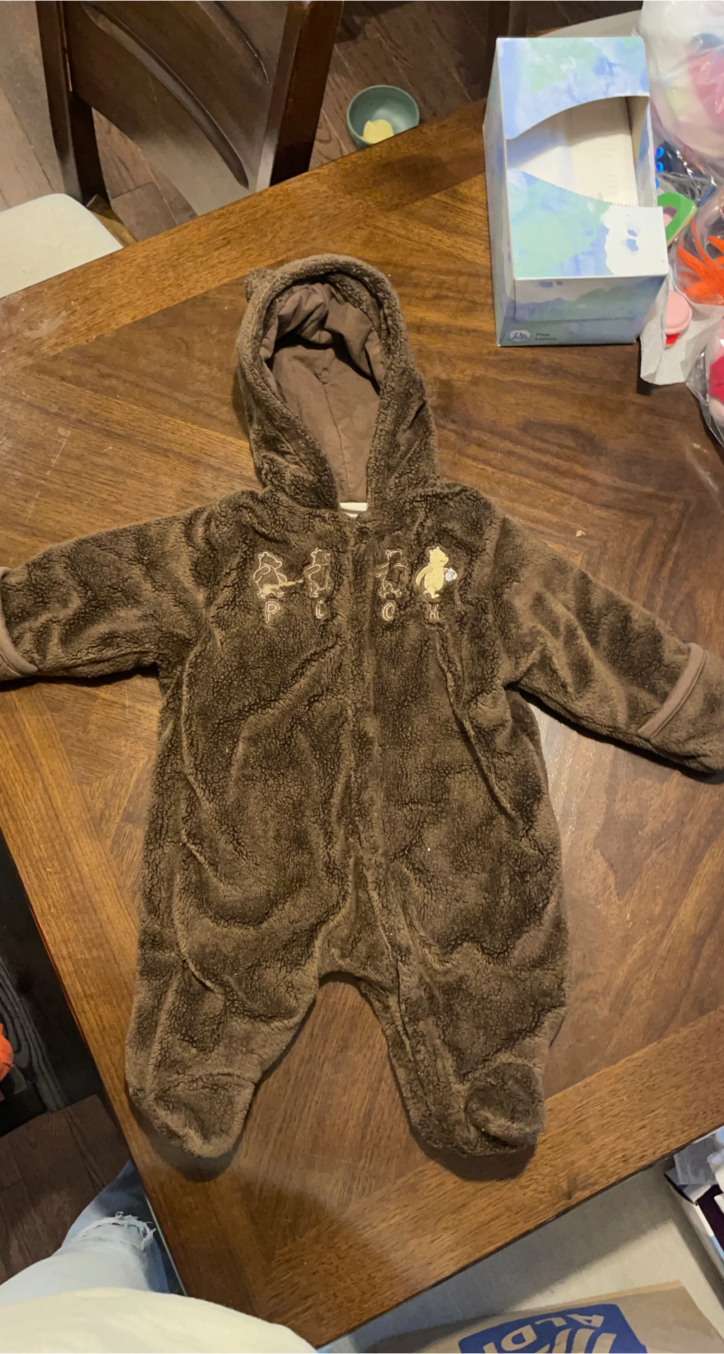 Selling a super cute Disney baby outfit! It's a soft, brown fleece onesie with a hood, perfect for keeping your little one warm.