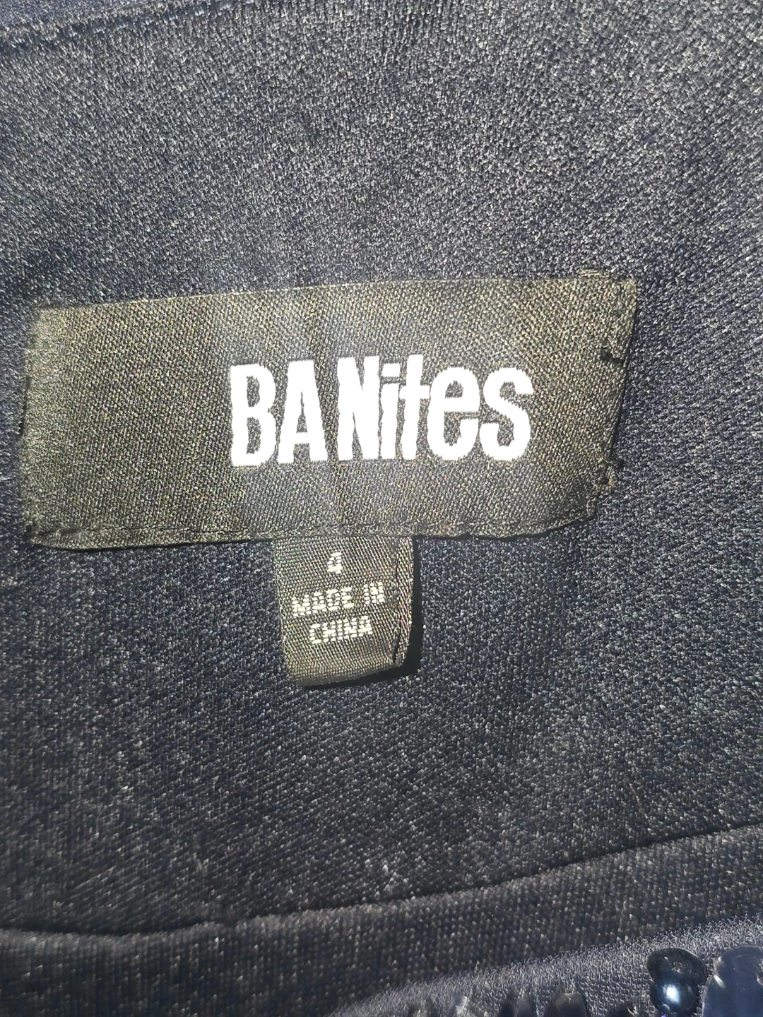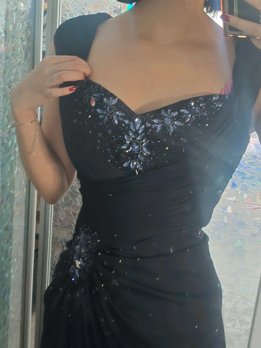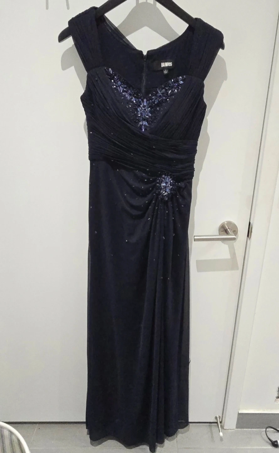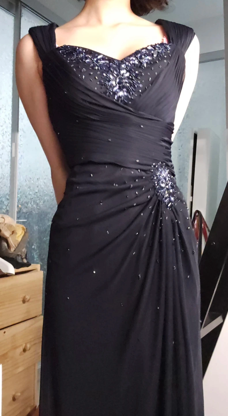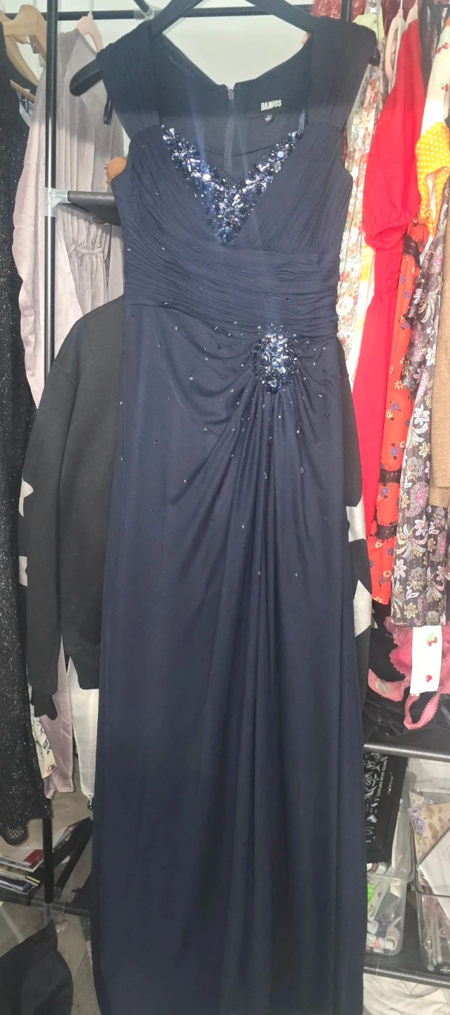 This BA Nites evening gown is black with intricate blue embellishments on the bodice and hip. It features a flattering ruched bust and a flowing skirt. It's perfect for formal events! Also has a slight slit for the leg, so it's nice to walk in and not too hot to wear for a long time.