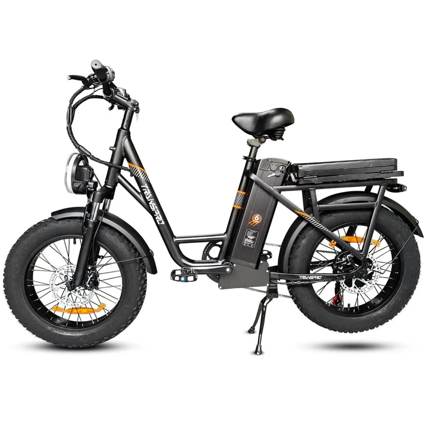 TRANSPRO fat tire electric bike. Features a removable battery for easy charging. Front headlight and rear rack included. Pedal assist and throttle options available. Dual battery in one 48V26AH & motor is 48V750W. Missing one pedal ,I have 2 brand pedals it comes with & An EXTRA PAIR OF KEYS💯.Battery itself cost $600.