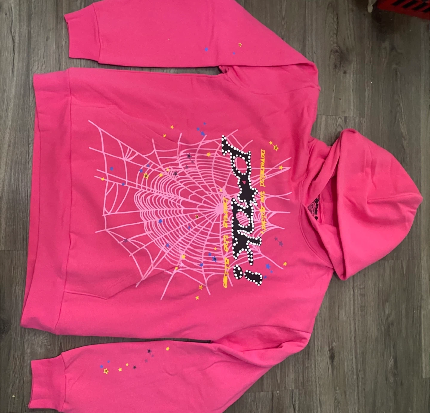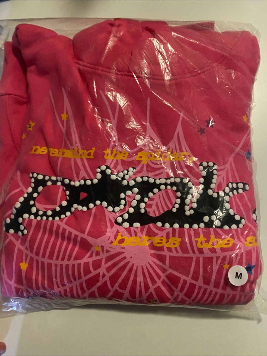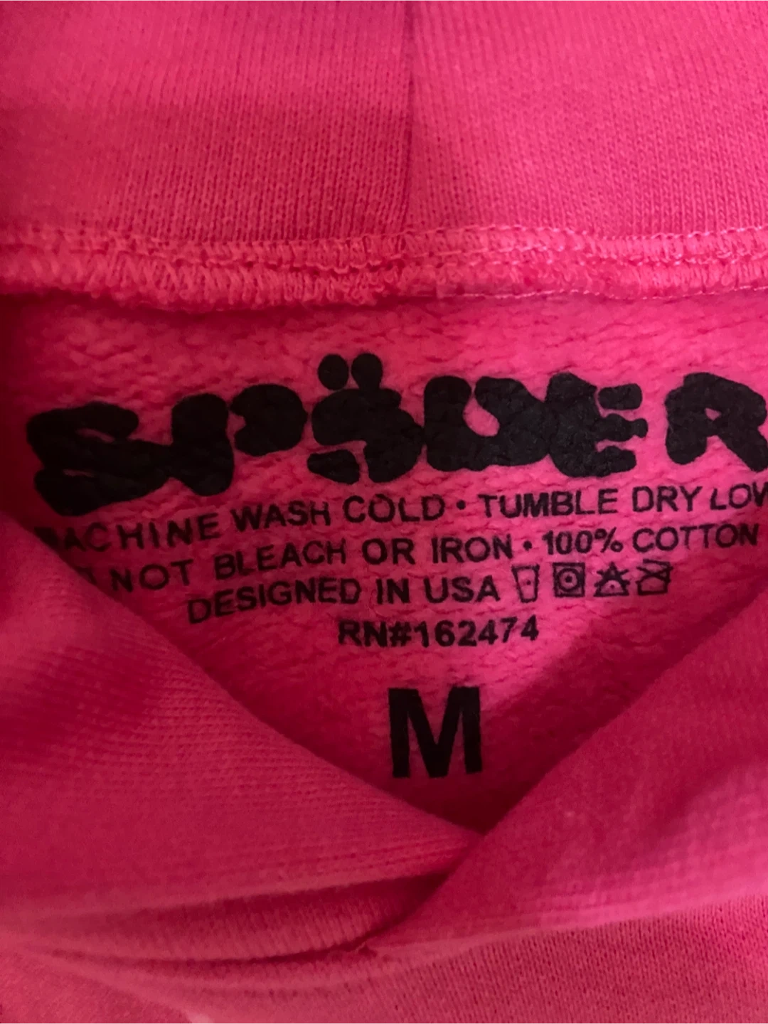Selling a SP5DER hoodie in pink! It's a size medium and made of 100% cotton. The design features a spiderweb and the SP5DER logo. It's in great condition!