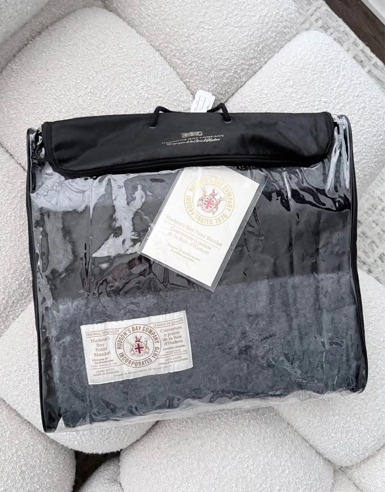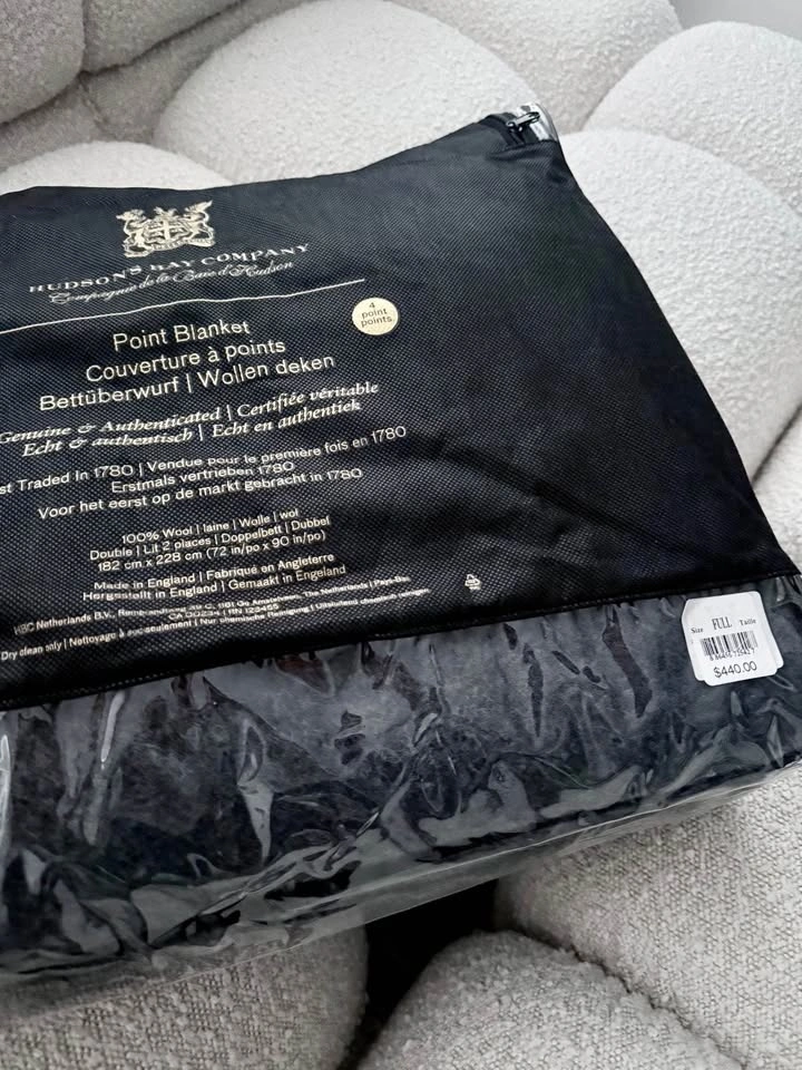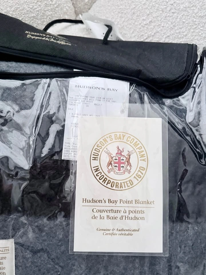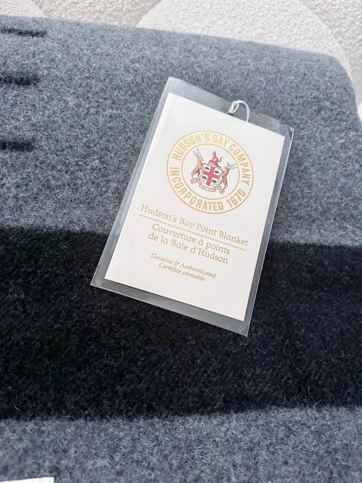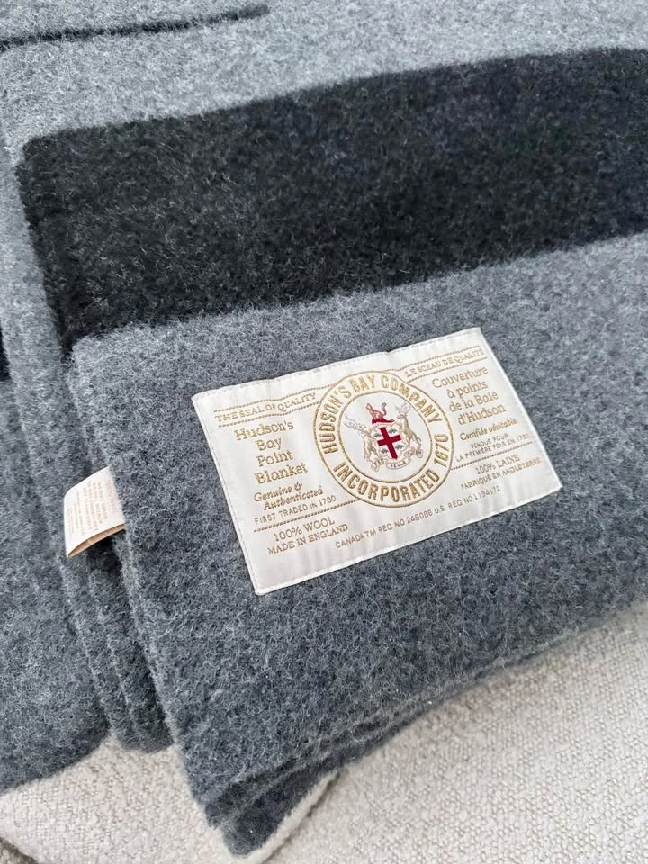 Genuine & authenticated 100% wool Hudson's Bay point blanket, made in England. Historic HBC trading blanket. Full size, measures 72 x 90 inches. Still in original packaging with price tag. 4 point size, fits full or queen bed or use as throw. Just taken out of package to show up close. Purchased from The Bay downtown when it was still open. Has not been used, kept in storage. Hold a piece of history. Beautiful grey/black neutral colour. Stay warm this winter! Pickup downtown Toronto.