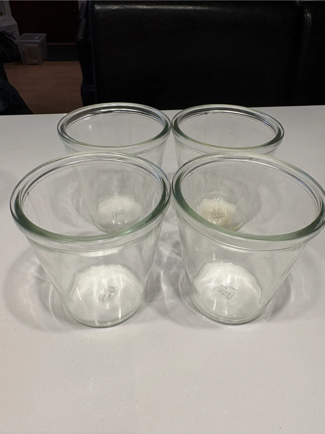 Four clear glass jars, perfect for storing small items or for crafting. Also great for baking and desserts. They're made of durable glass. Each jar measures approximately 3.5 inches tall.