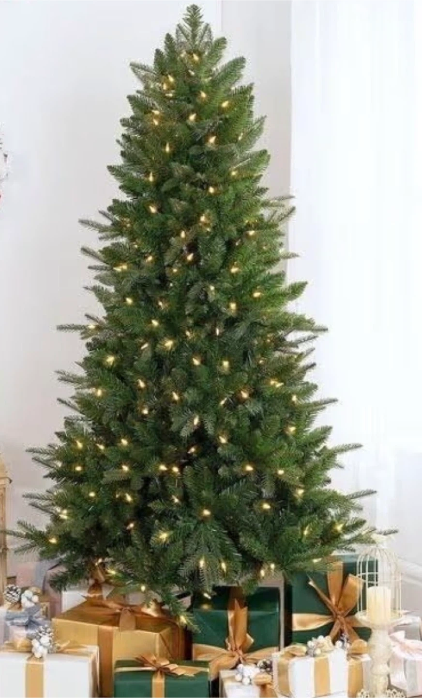 This is a pre-lit artificial Christmas tree with warm white lights. It's a festive addition to your holiday decor. The tree has a full shape with realistic needles.