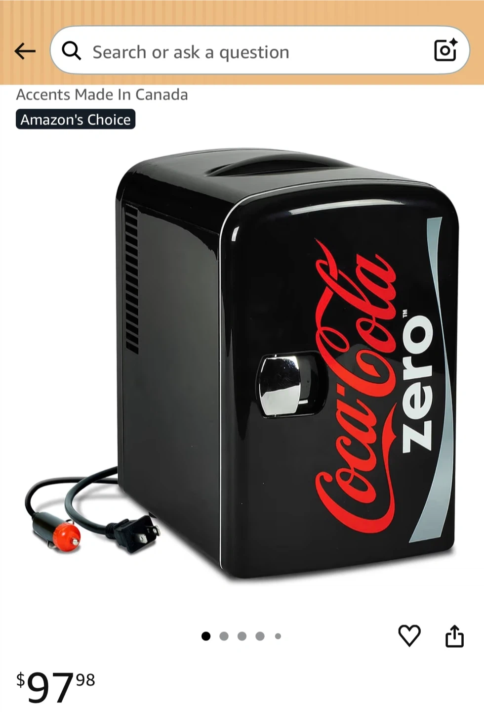 This is a Coca-Cola Zero branded mini fridge. It's black with the iconic Coke Zero logo. It comes with a power cord for your convenience. It's great for keeping drinks cool in a bedroom or office!