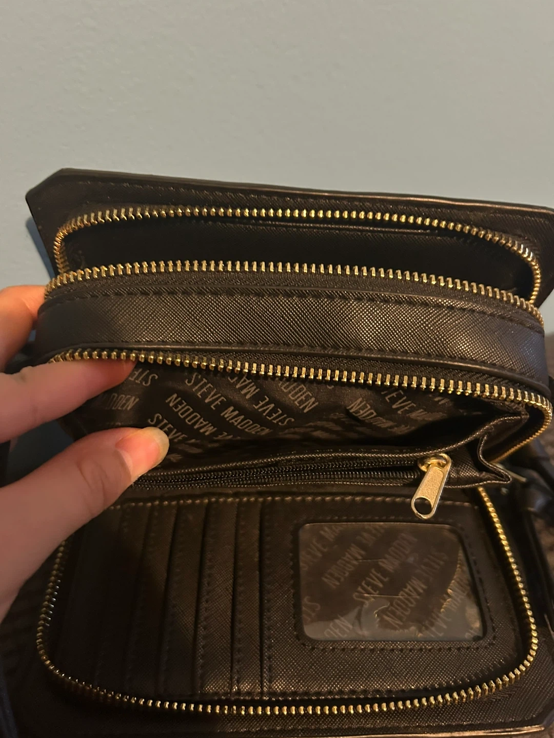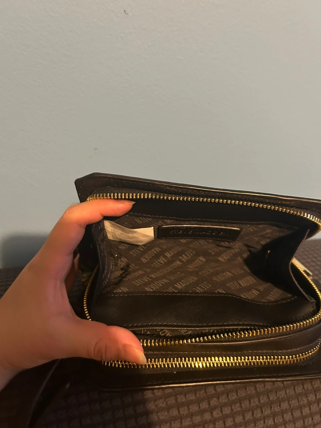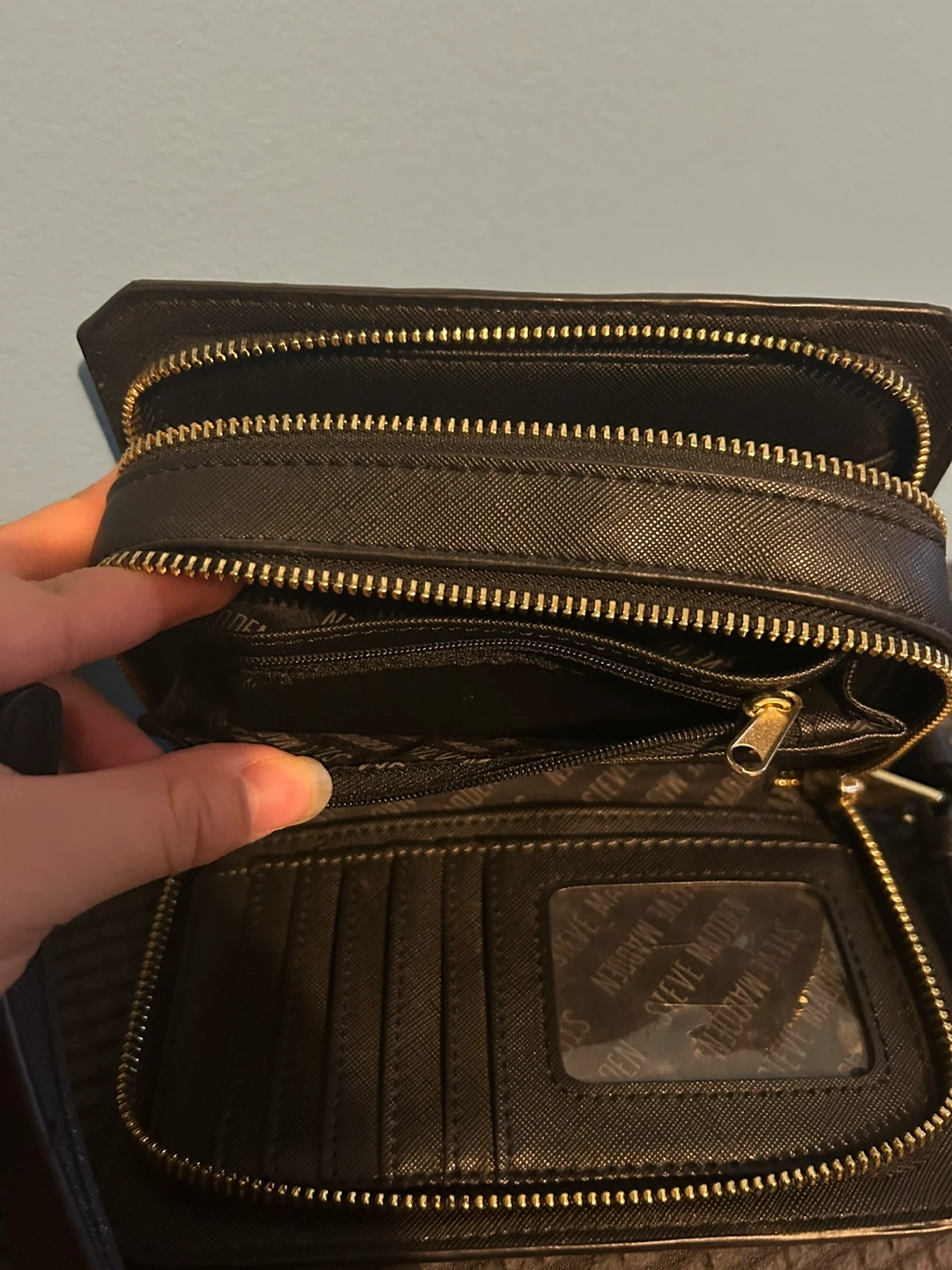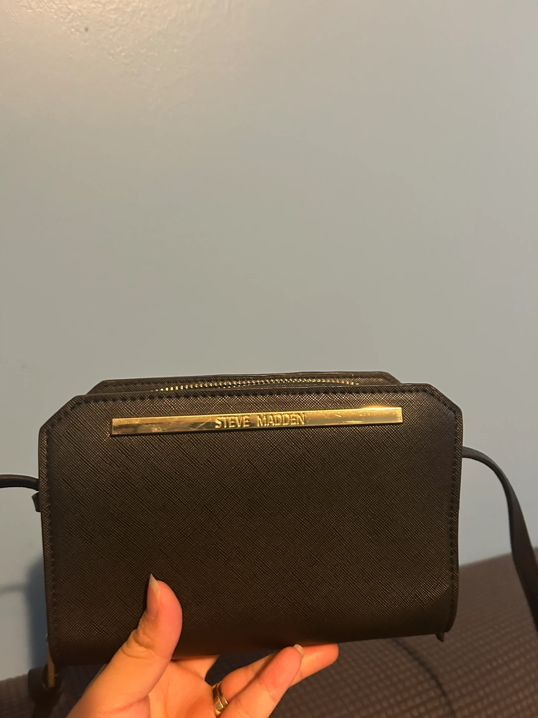 Selling a cute Steve Madden crossbody bag in black! It features a sleek design with gold-tone hardware and a convenient adjustable strap. Perfect for everyday use or a night out