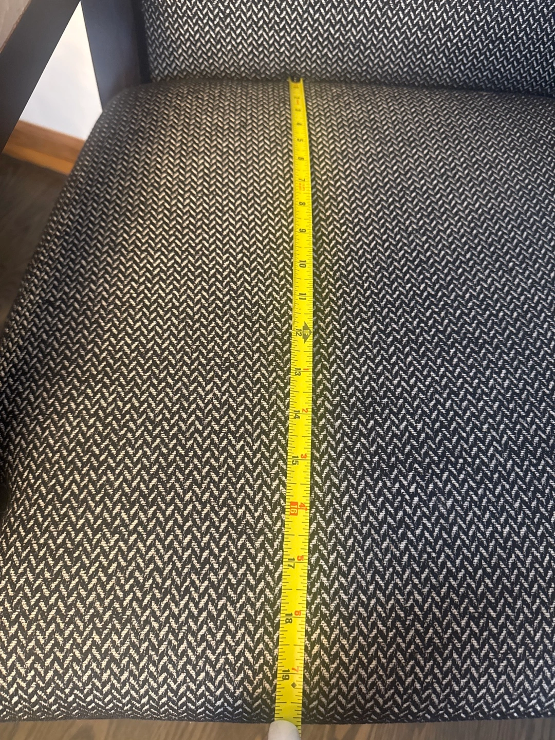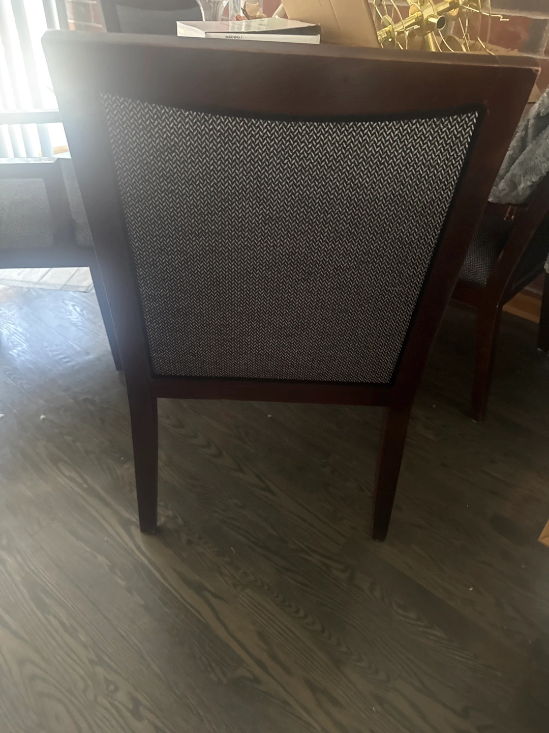 wide seat (4) with a dark real wood frame and patterned fabric seat and back. It's in good condition and ready for a new home!