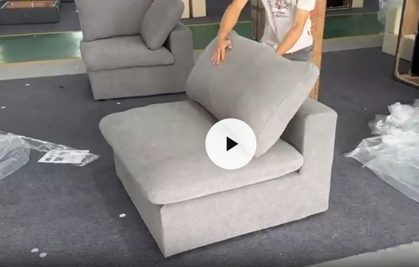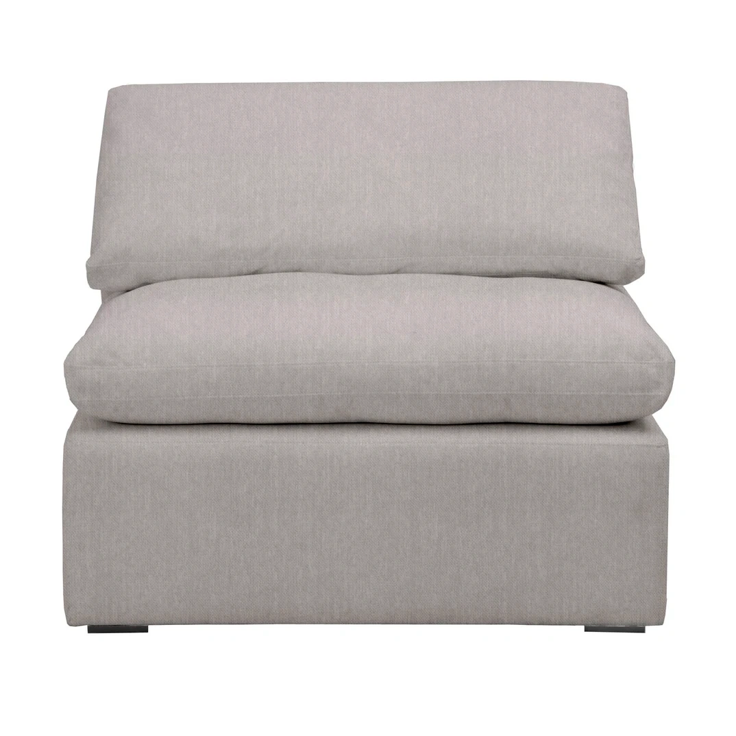 This is a light beige fabric armless chair. It's upholstered in a soft, durable fabric. The cushions are plush and provide comfortable seating. Cushions are still wrapped. Bought on Facebook marketplace but it doesn't fit in our space