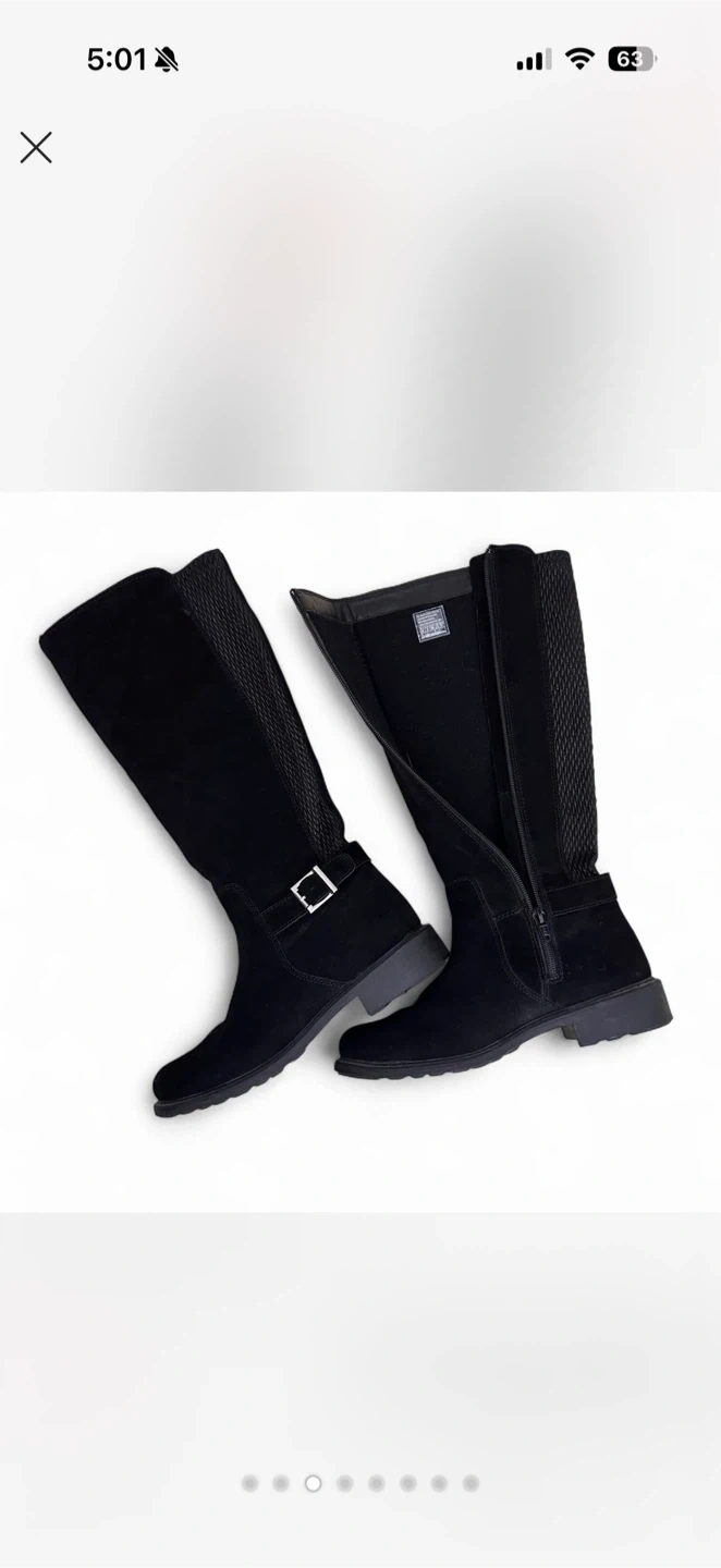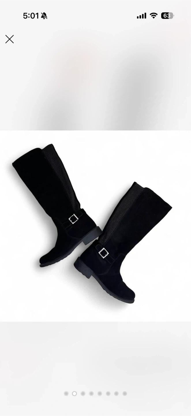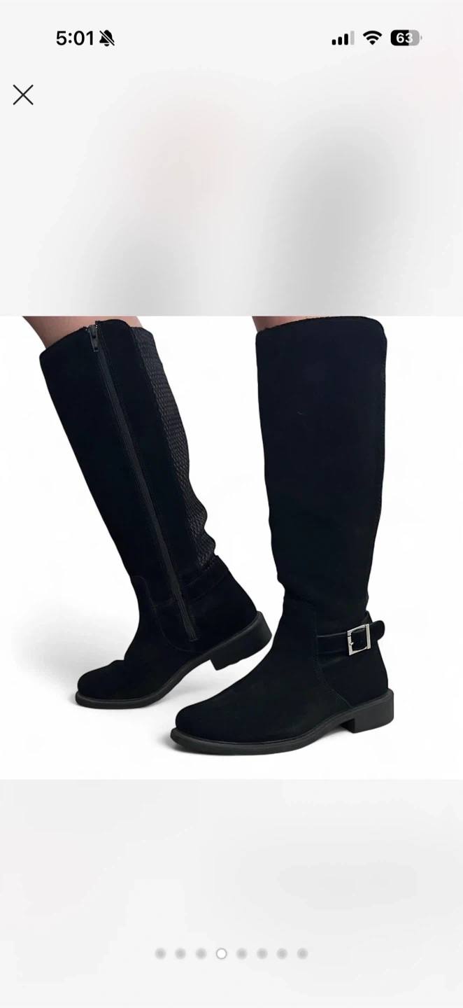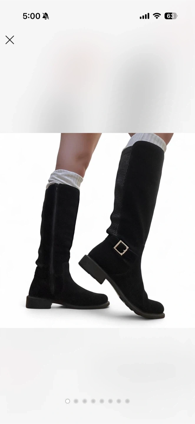These knee-high boots are made of black suede. They feature a decorative buckle strap at the ankle and a side zipper for easy on and off. The textured panel on the back shaft adds a stylish touch. These boots are suitable for everyday wear.