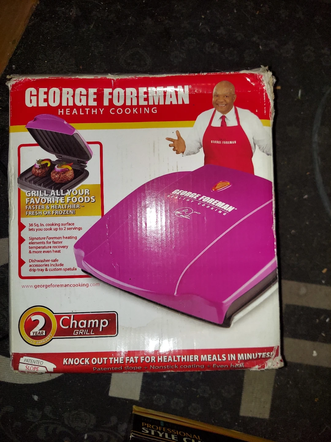 George Foreman Champ Grill with 36 Sq. In. cooking surface. It cooks up to 2 servings. The grill has signature Foreman heating elements for faster temperature recovery and more even heat. Dishwasher-safe accessories include a drip tray and custom spatula.