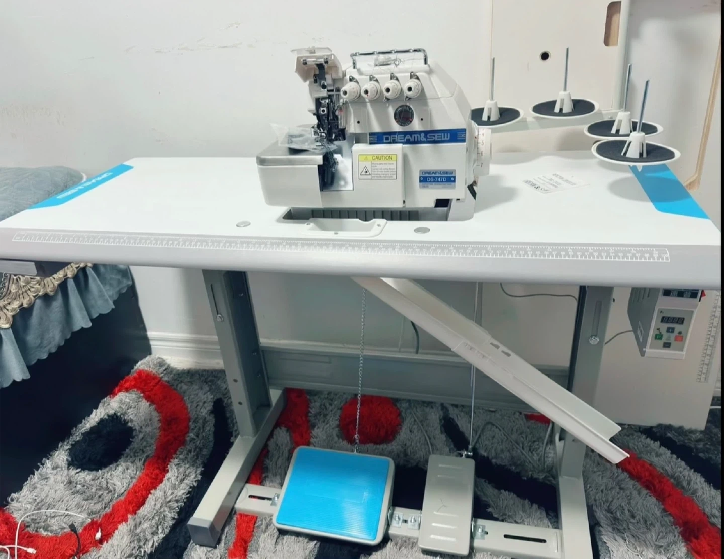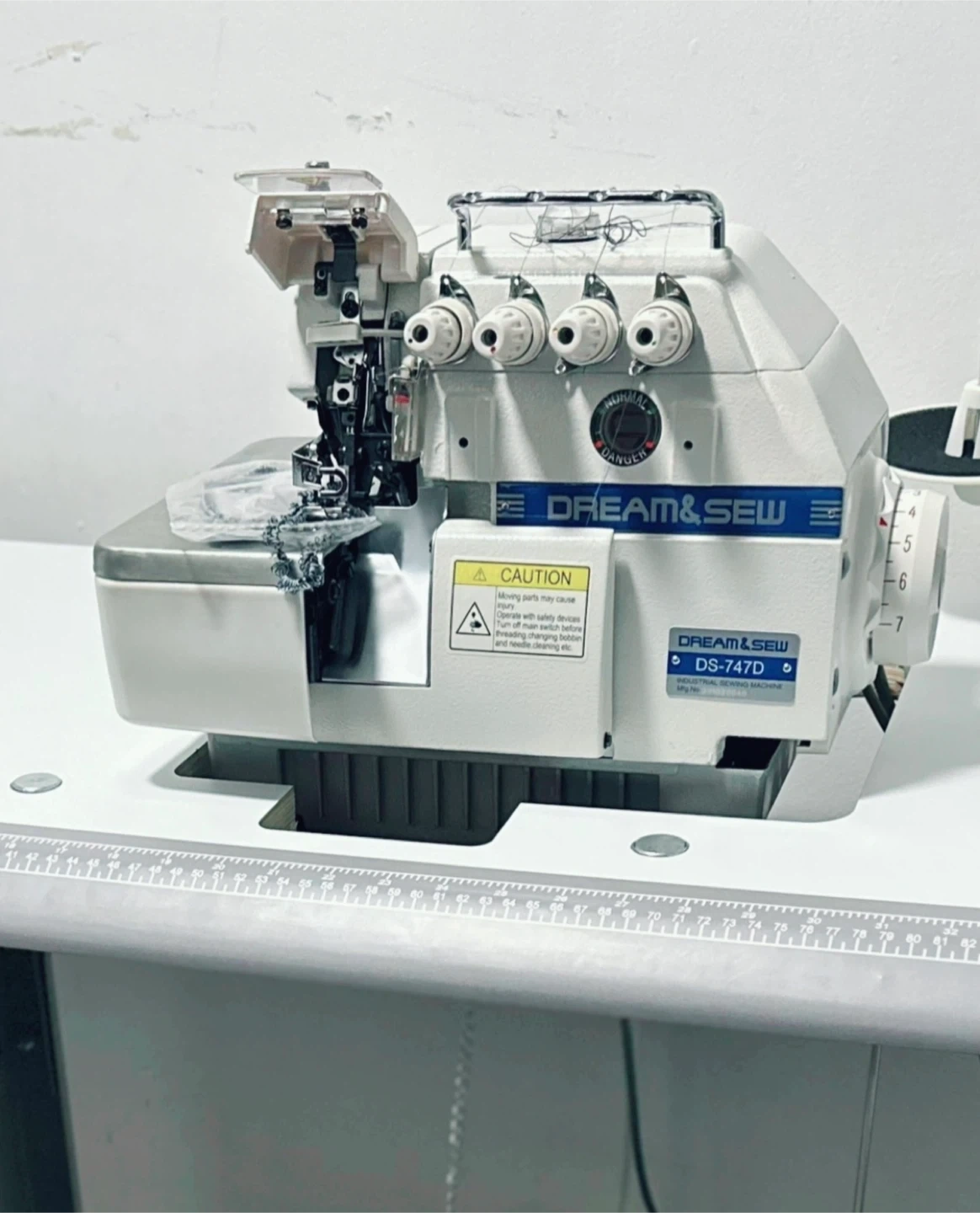 This is a DREAM&SEW DS-747D serger sewing machine, complete with a table and foot pedal. It's a reliable machine for various sewing projects. The table has a built-in ruler for precise measurements.
