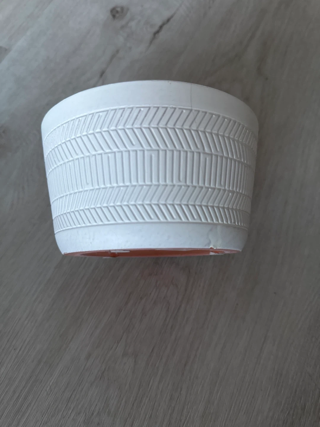 Off-white ceramic planter pot is white with an embossed chevron pattern around the exterior. The interior has a rustic orange hue. It's suitable for small to medium-sized plants.