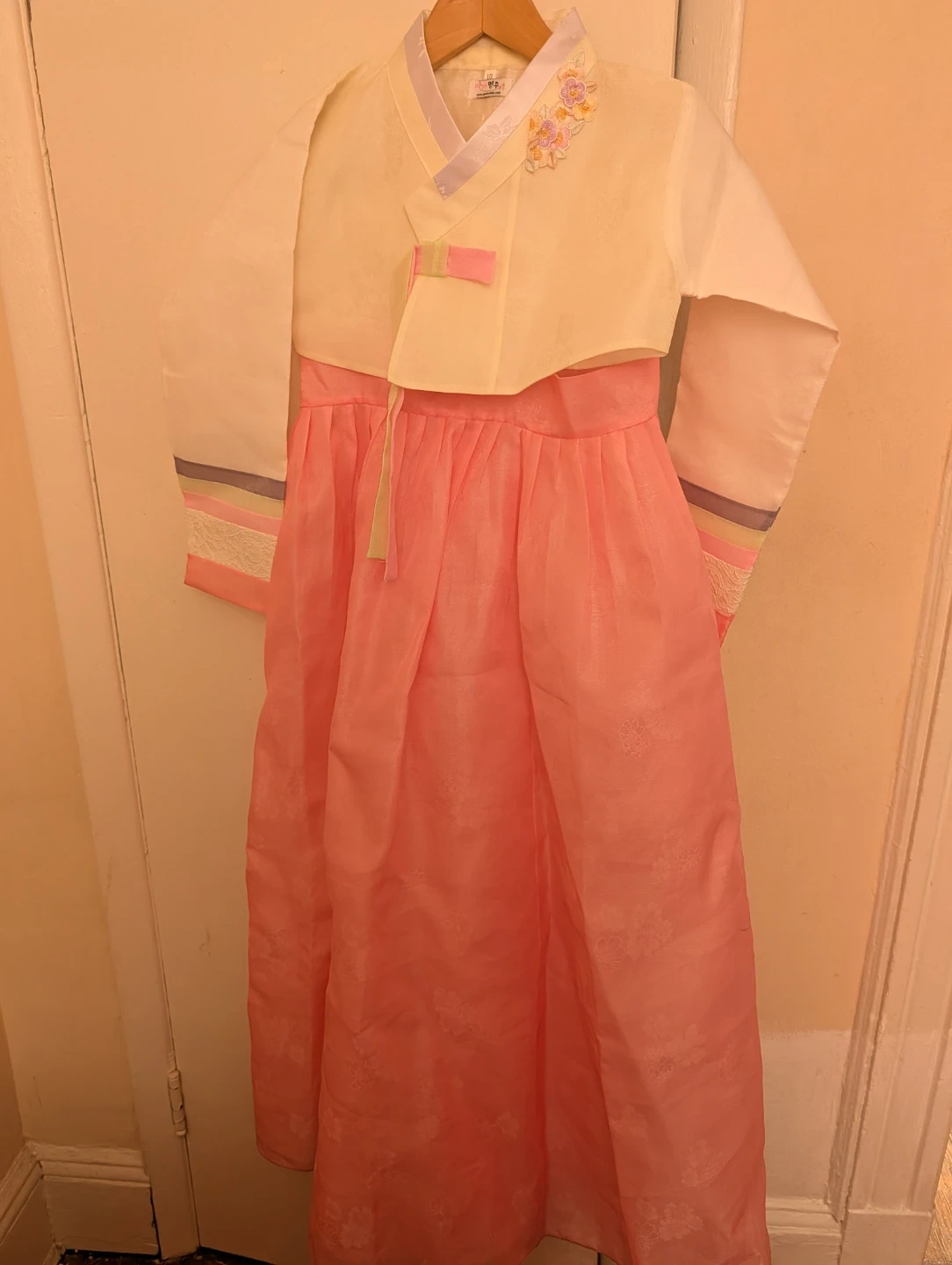 This is a beautiful children's hanbok. It features a pale yellow jeogori top with delicate floral embroidery and a vibrant pink chima skirt. The sleeves have colorful ribbon accents. Size 10.