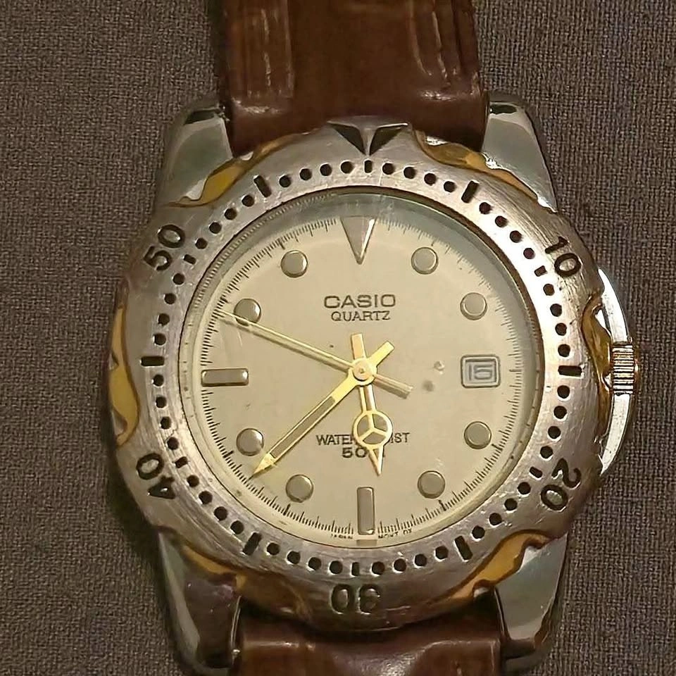Found this nice vintage Casio MTP-3005. It’s got a great classic look, but it’s been sitting for a while so it needs a new battery. The strap is pretty worn out and should be replaced, but it takes a standard 20mm band so you can easily swap in whatever style you like. Case and glass are in good shape for its age. Great little project if you want a solid watch for cheap. Must go ASAP!☺️