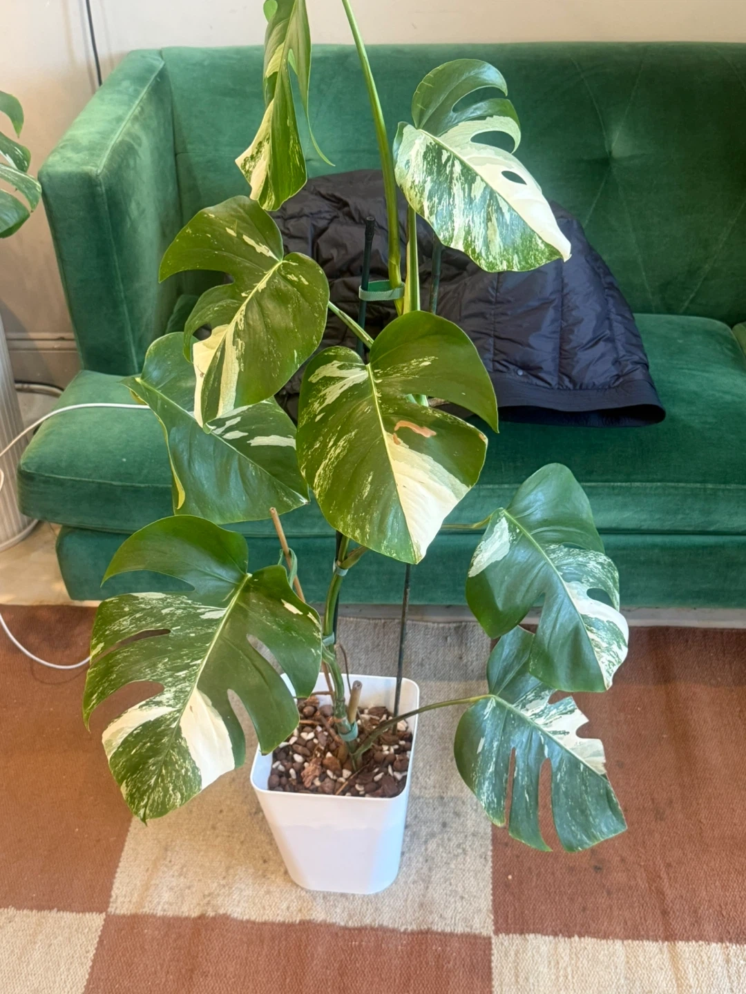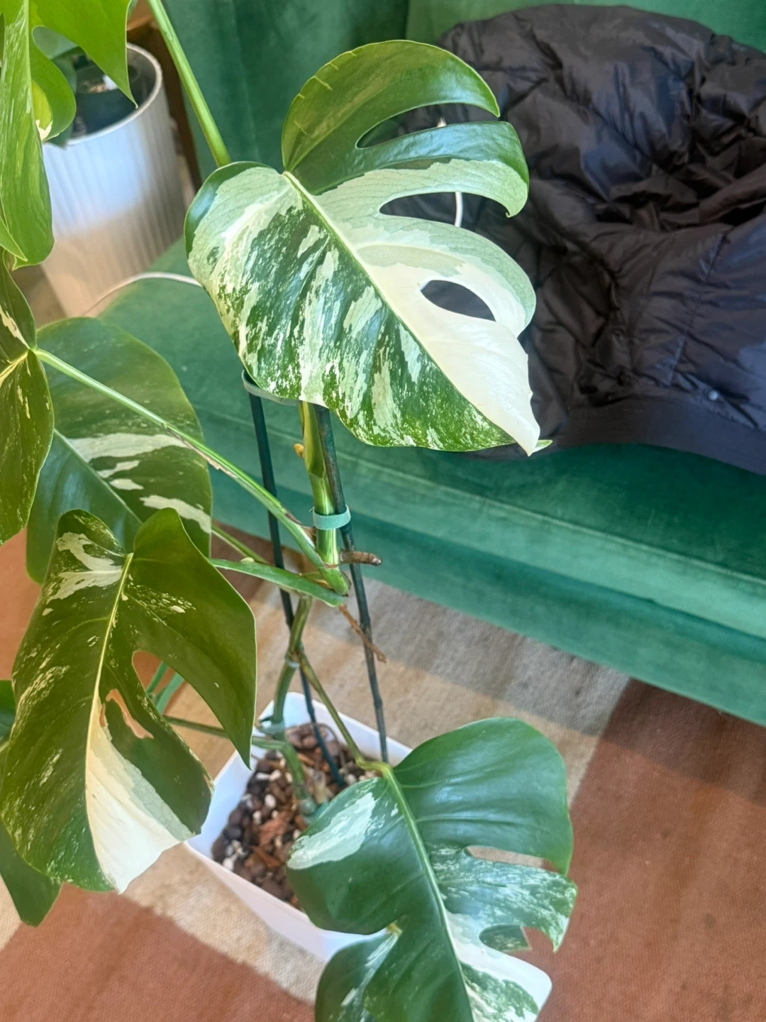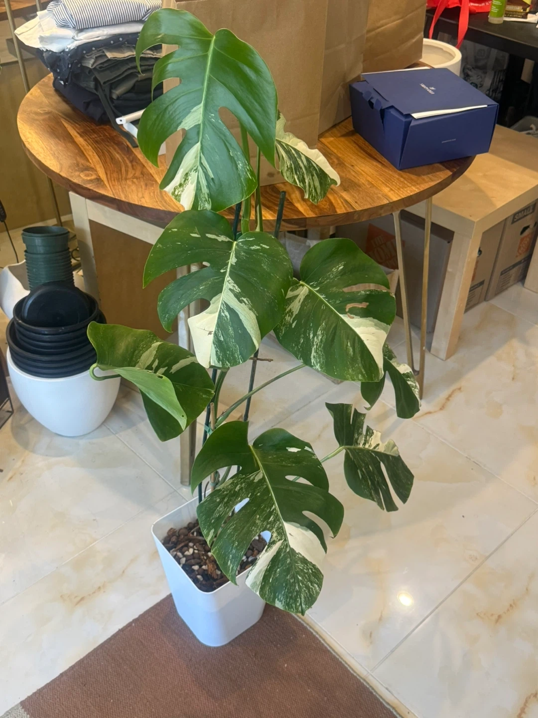 Healthy 48” tall Monstera Albo plant with vibrant variegation. Features well variegated and fenestrated leaves. Comes in a 8”white pot and garden sticks.