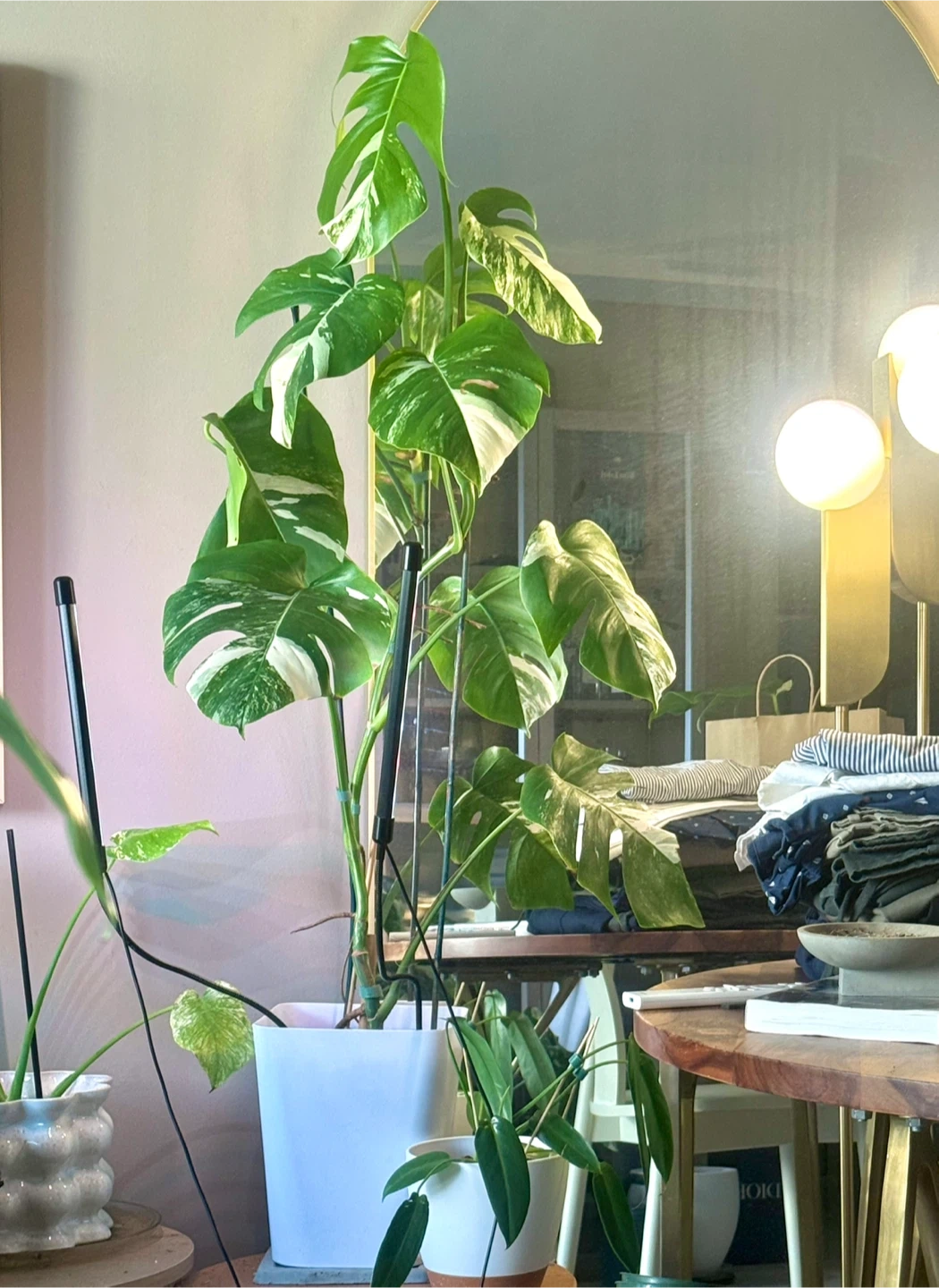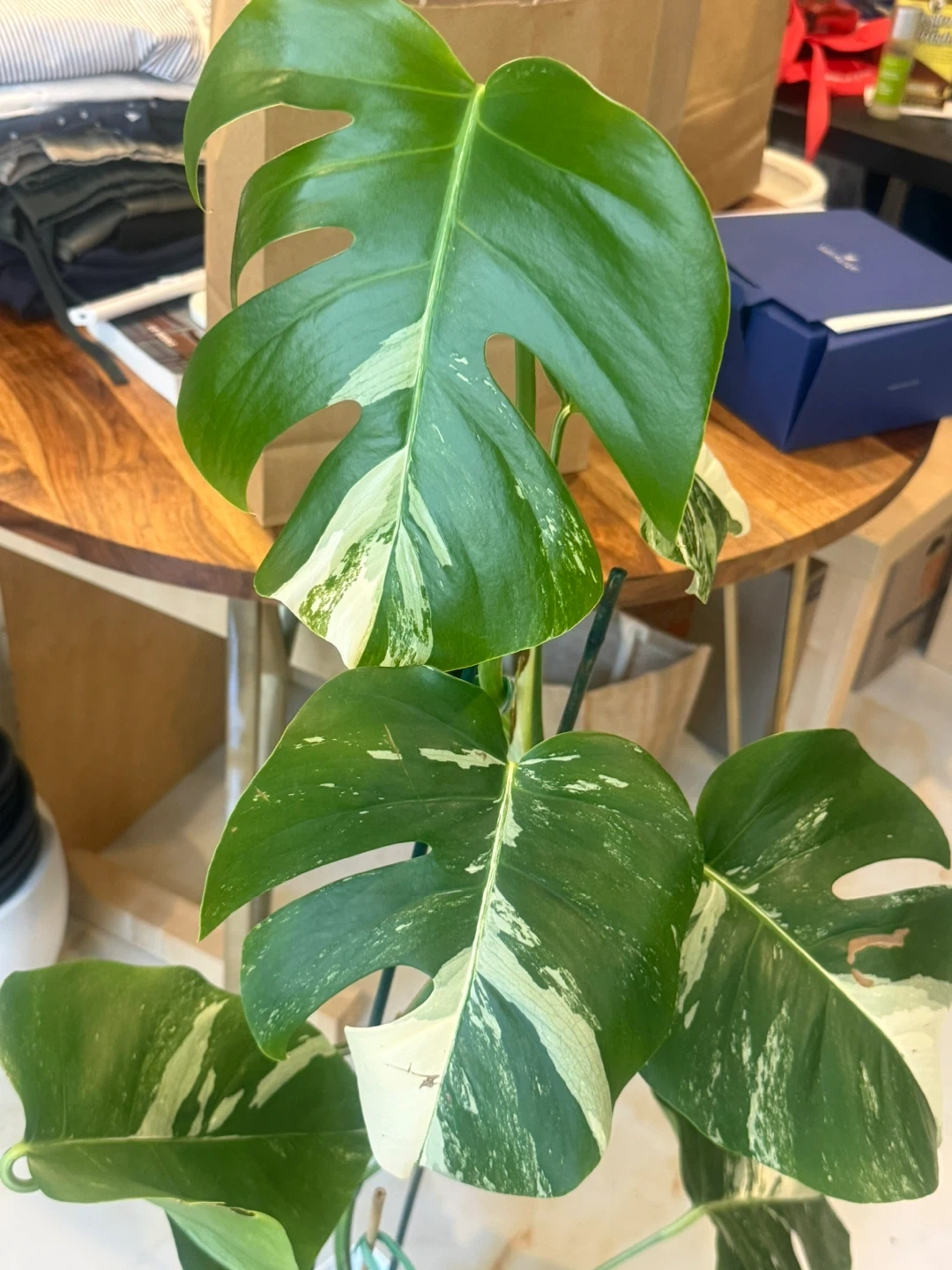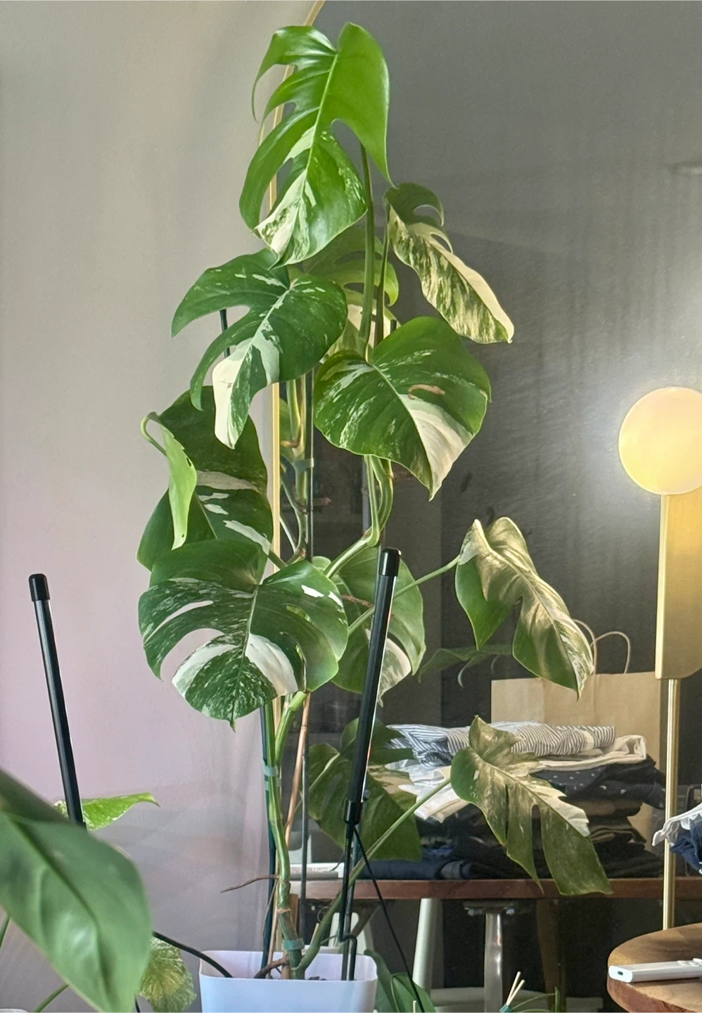 Healthy 48” tall Monstera Albo plant with vibrant variegation. Features well variegated and fenestrated leaves. Comes in a 8”white pot and garden sticks.