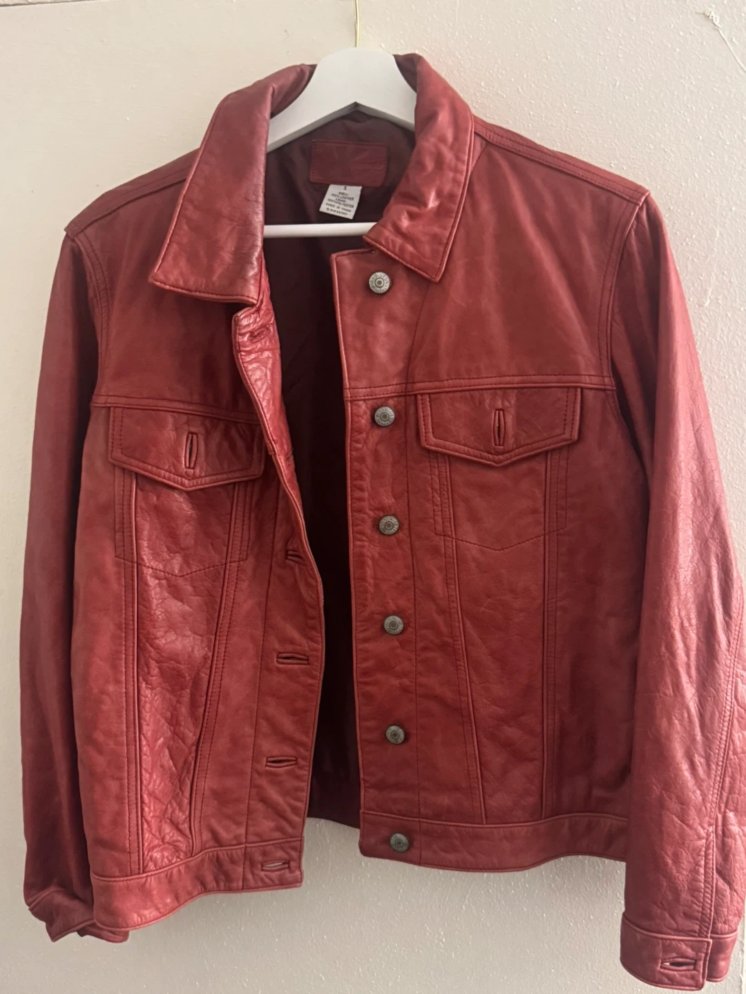 This is a red leather trucker jacket. It's made from genuine leather and features a classic button-up front. The jacket has two chest pockets with button closures and two hand pockets.