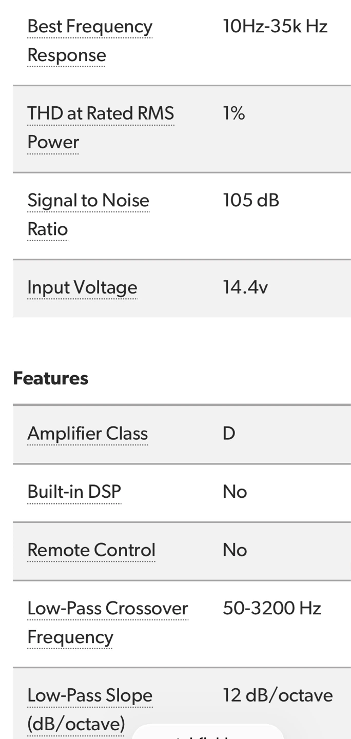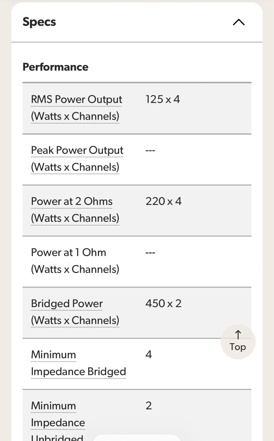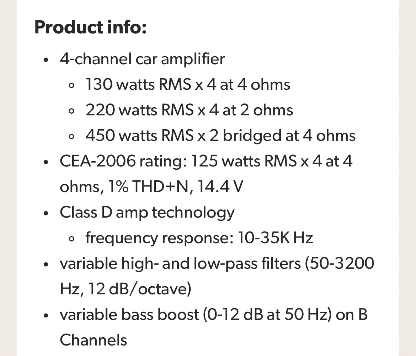 This is a 4-channel car amplifier. It offers 130 watts RMS x 4 at 4 ohms or 220 watts RMS x 4 at 2 ohms. Class D amp technology with a frequency response of 10-35K Hz. Features variable high- and low-pass filters and variable bass boost.