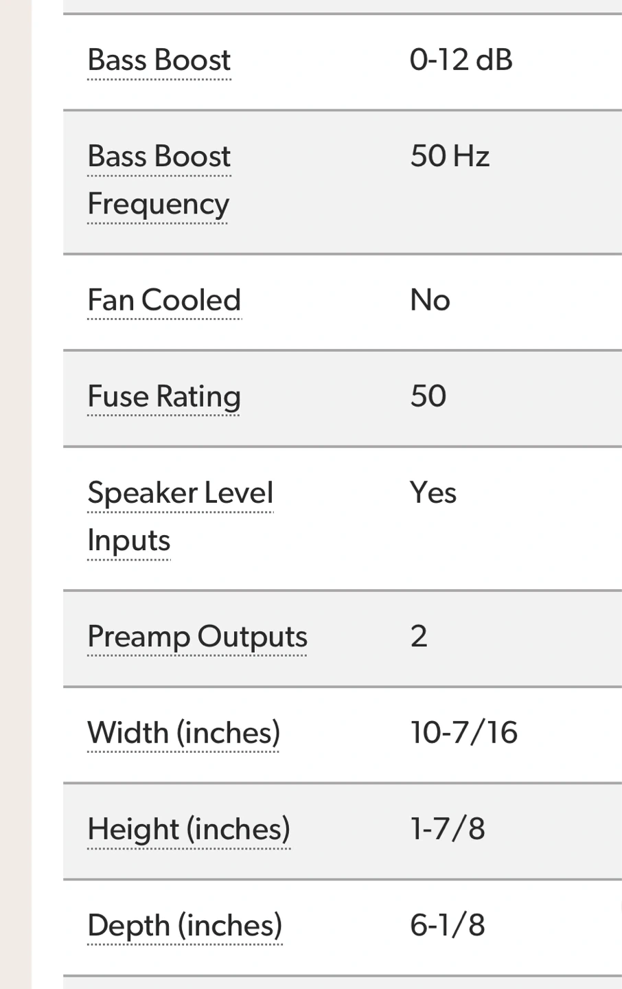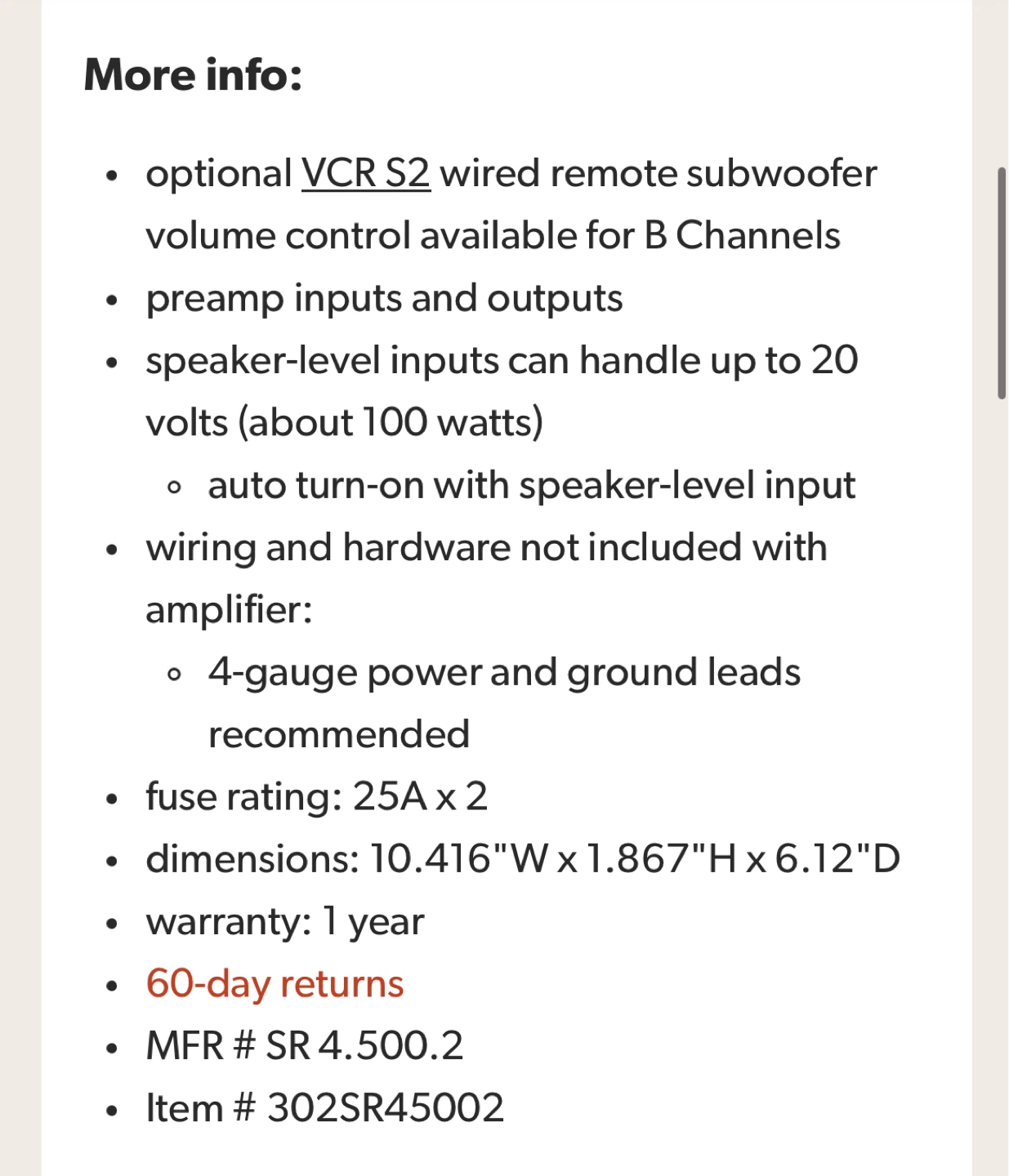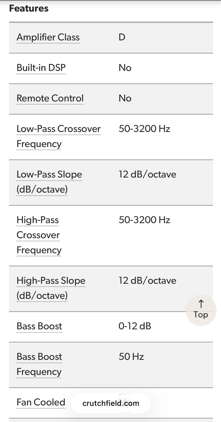 This is a 4-channel car amplifier. It offers 130 watts RMS x 4 at 4 ohms or 220 watts RMS x 4 at 2 ohms. Class D amp technology with a frequency response of 10-35K Hz. Features variable high- and low-pass filters and variable bass boost.