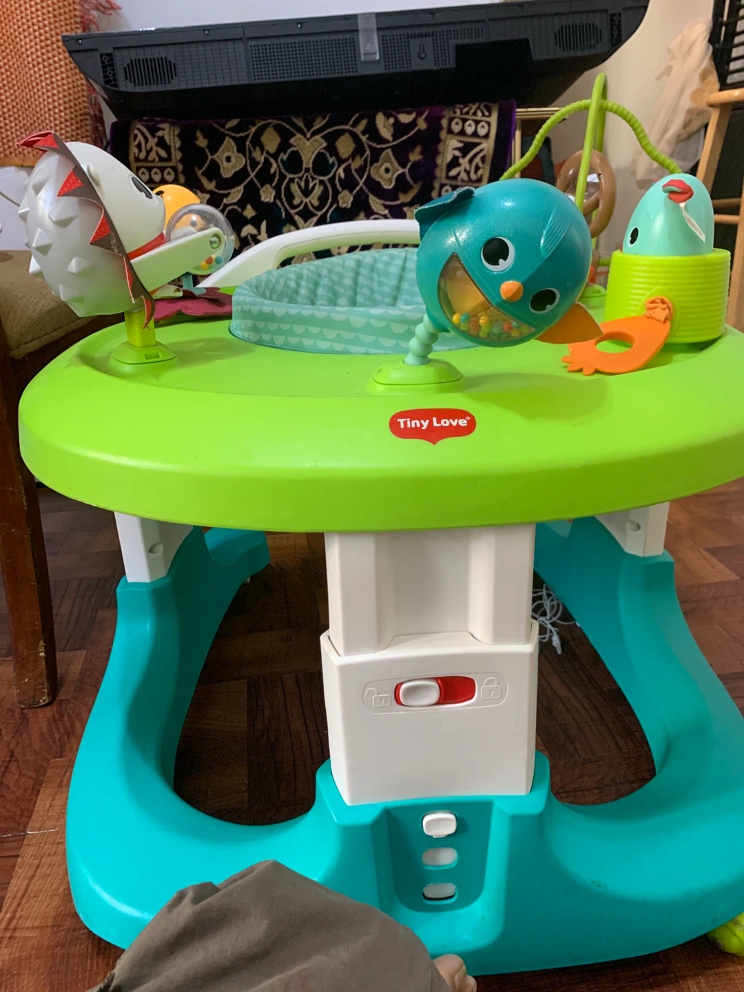 This is a Tiny Love developmental play activity table. It features a brightly colored activity center with engaging toys. The height is adjustable for your child's growing needs.