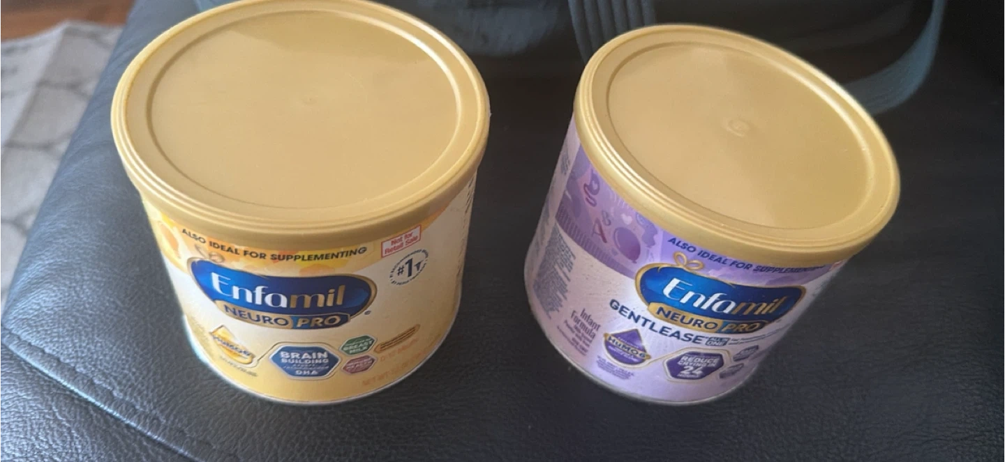 Two cans of Enfamil Neuro Pro infant formula. One is Neuro Pro, and the other is Neuro Pro Gentlease.