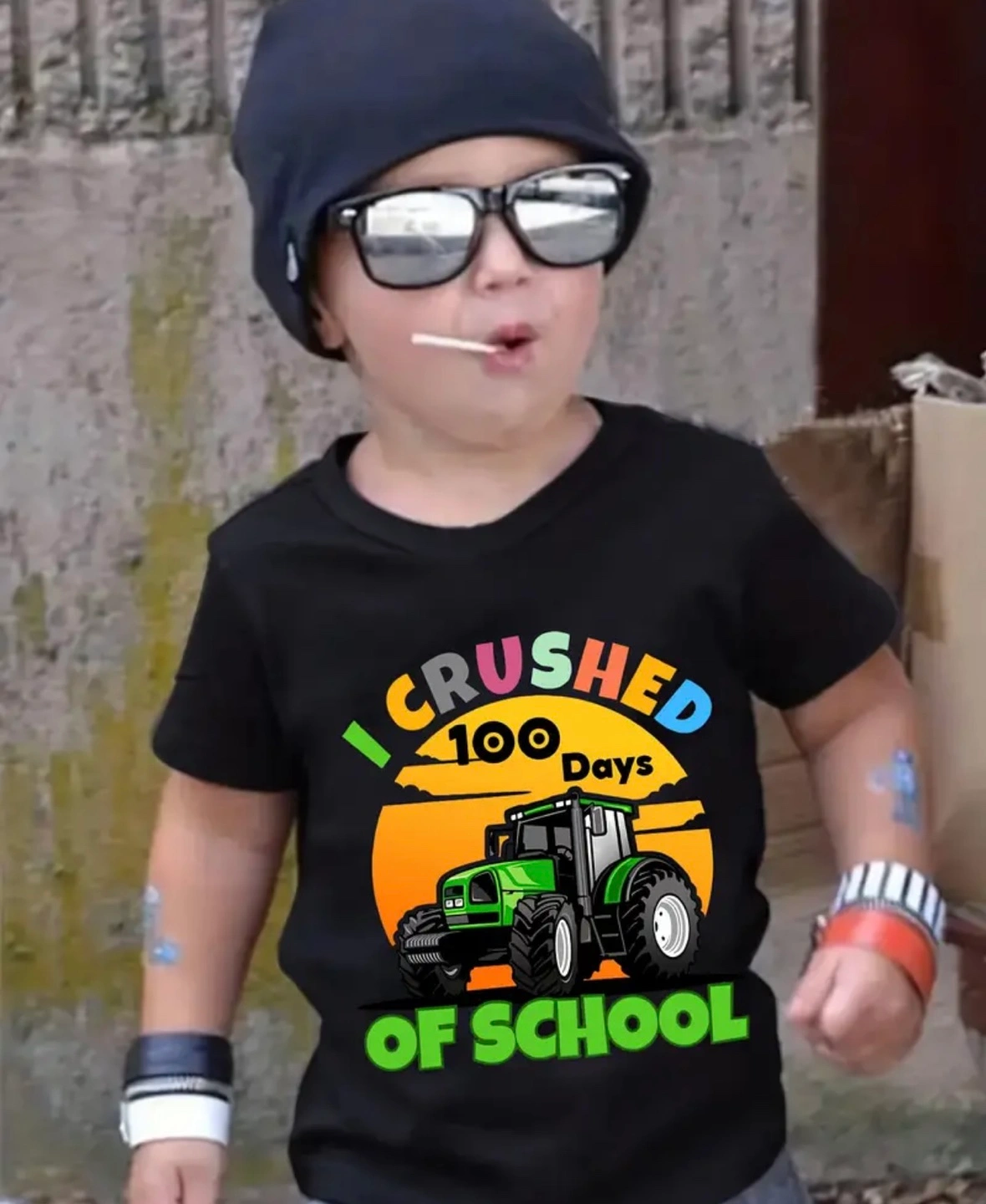 Black short-sleeved t-shirt with a graphic print. 100 Days of School graphic features a tractor and the words "I Crushed 100 Days of School".