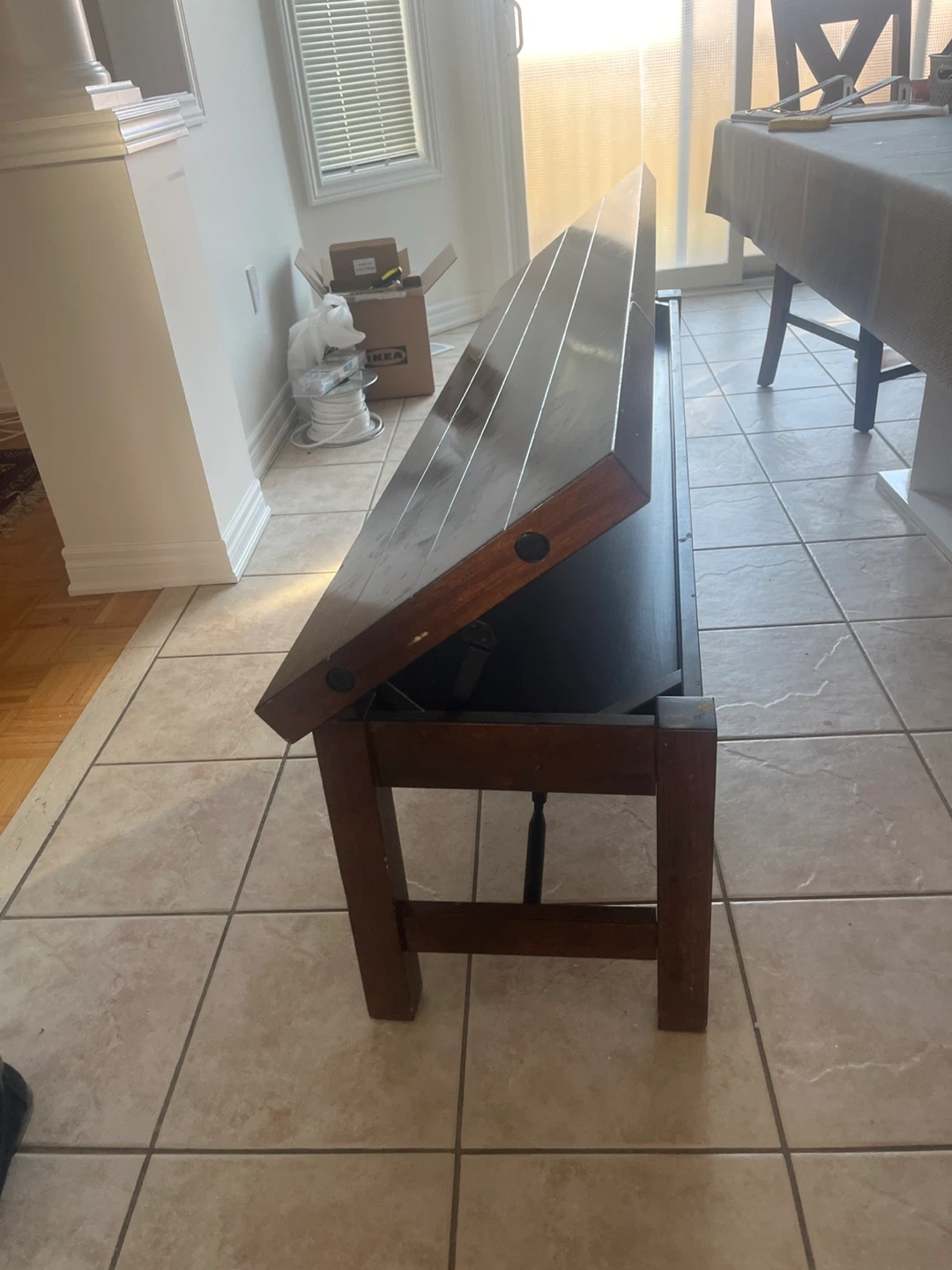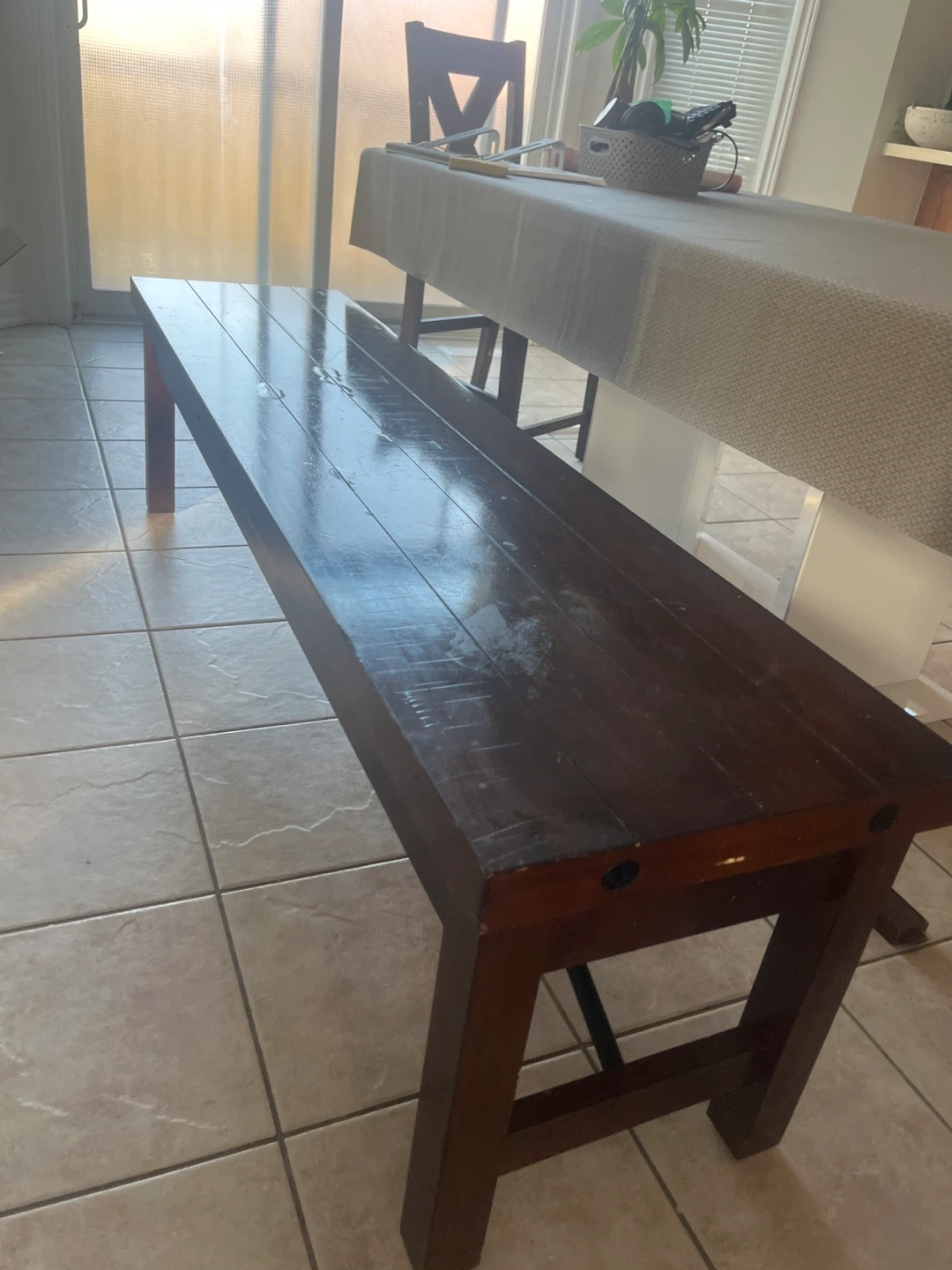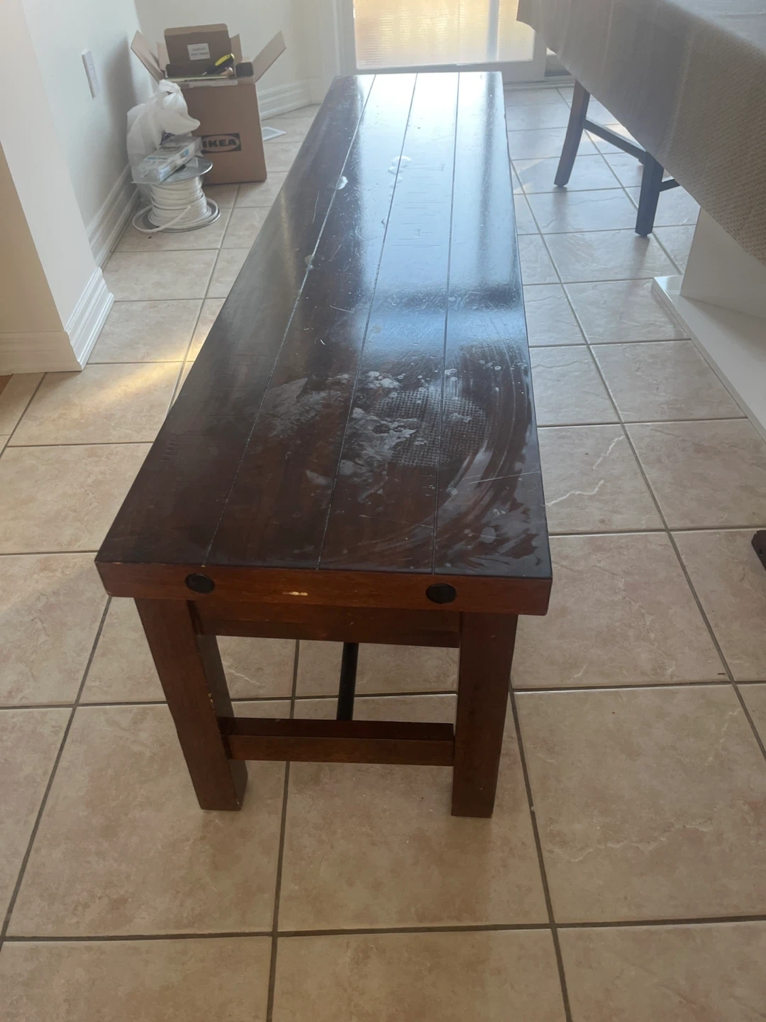 Selling a wooden bench in a dark brown finish. It's in good condition and would be a great addition to any dining room or entryway.
